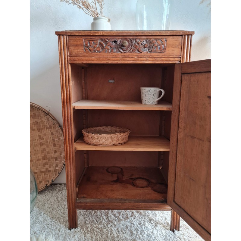 Superbe confiturier art déco. Stable, le tiroir coulisse bien. Quelques imperfections visibles sur les photos. Pas de clé, c'est une poignée (modification apportée) Très fonctionnel avec ses 2 étagères. Gabarit très facile à glisser dans un intérieur contemporain. Belle patine. Détails raffinés.