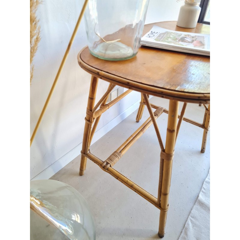 Superbe bureau en rotin vintage, pieds compas. Un charme fou. Des imperfections visibles sur les photos. Le tiroir coulisse bien en le tirant par les deux côtés mais pas avec la poignée destinée en principe à cette fonction. Stable. Belle patine.