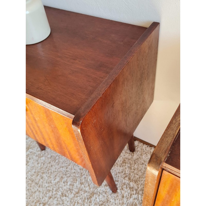 Très belle paire de chevets pieds compas circa années 60. Belle patine. Des imperfections visibles sur les photos, un léger décentrage sur l'anneau de droite. Stable. Belles lignes dans l'esprit scandinave.