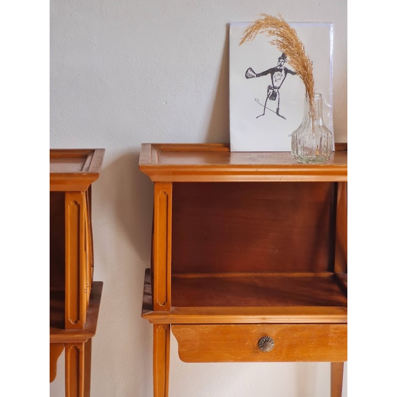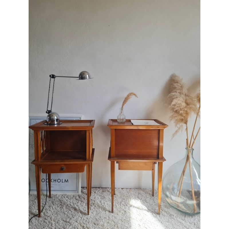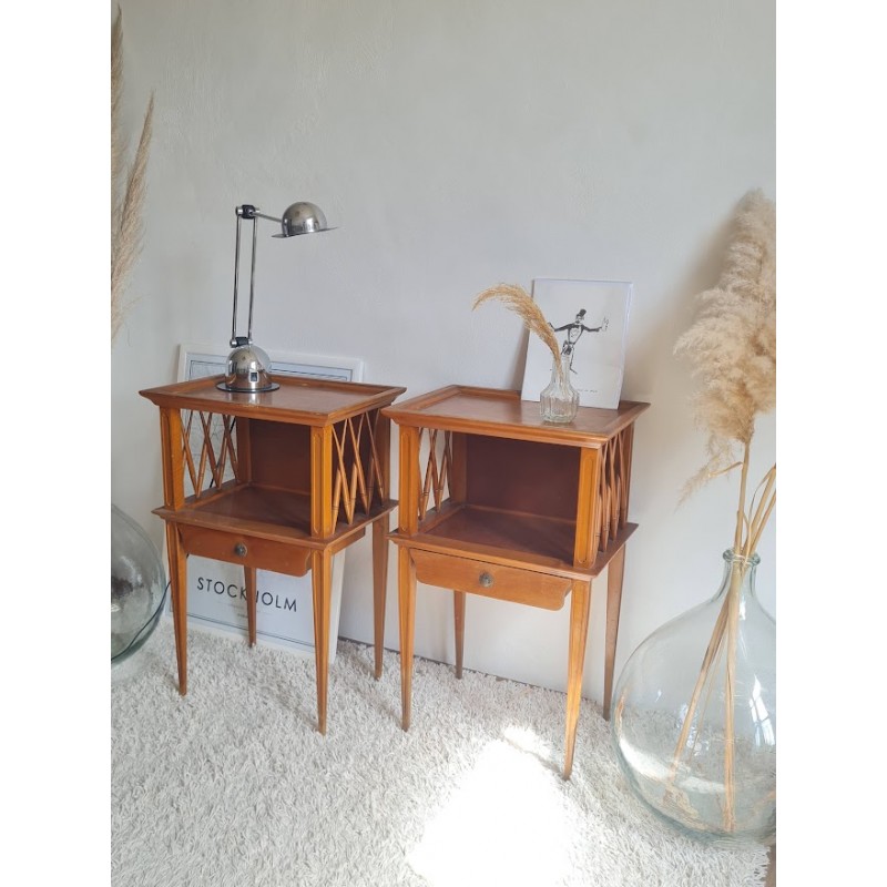 Paire de tables de nuit circa années 60, lignes élégantes et épurées dans l'esprit scandinave. Stables, des traces de vies visibles sur les photos. Pratiques avec chacune un tiroir qui coulisse bien.