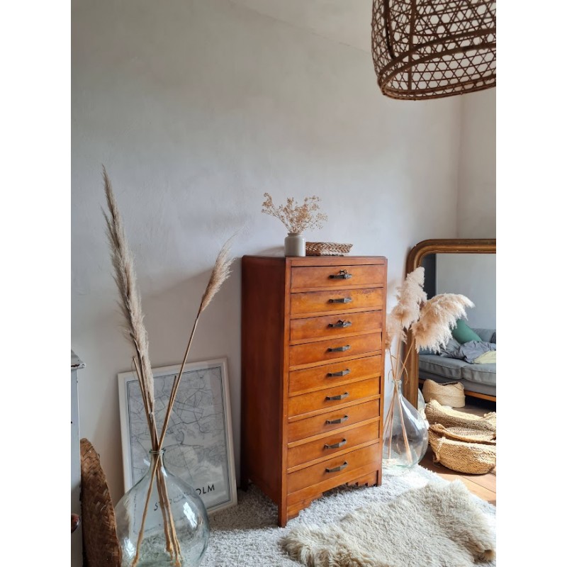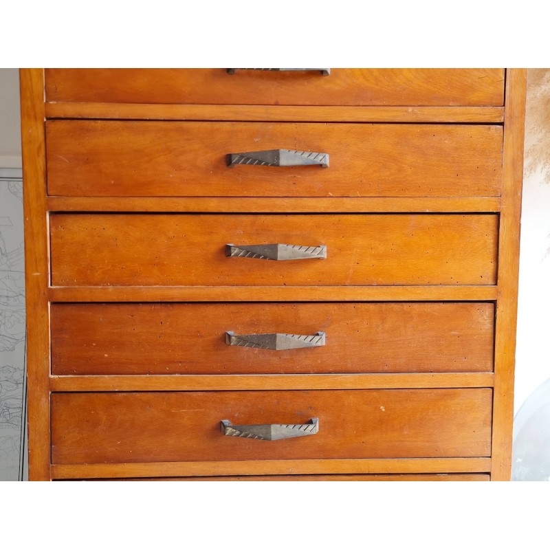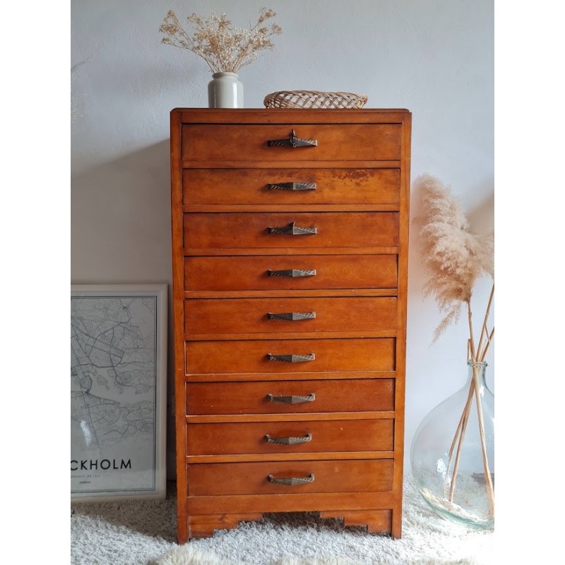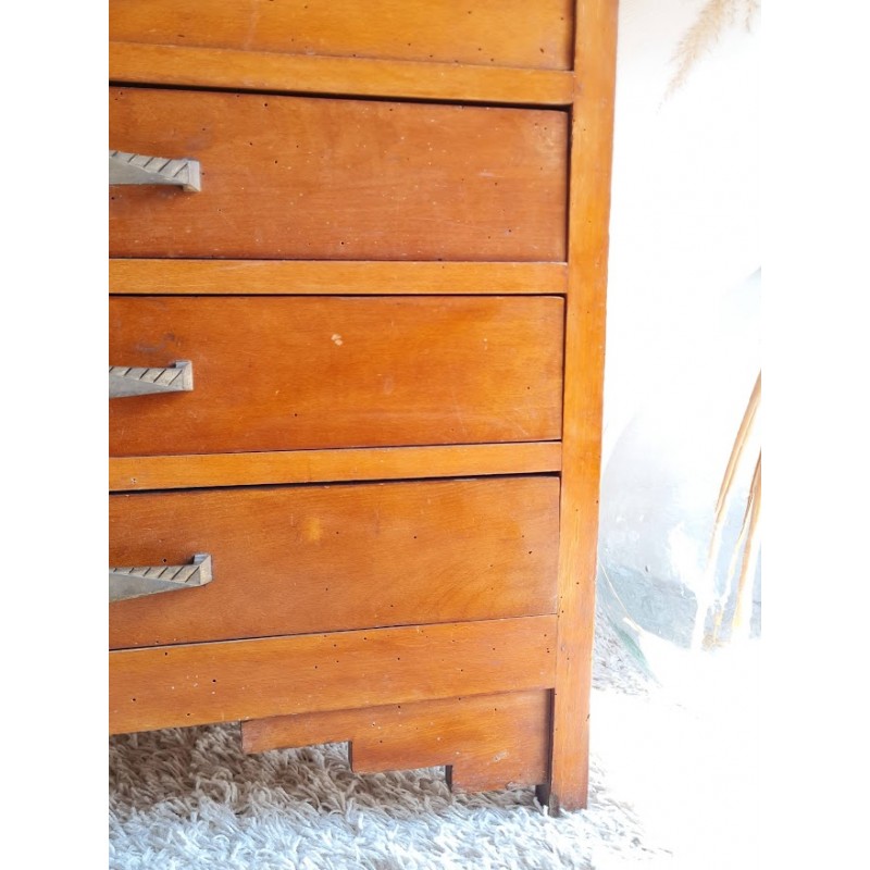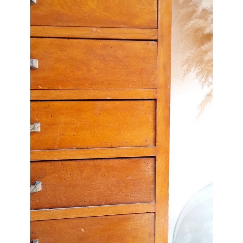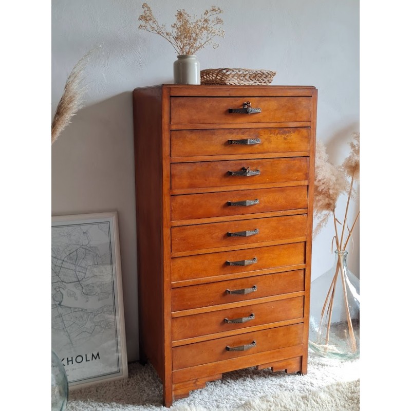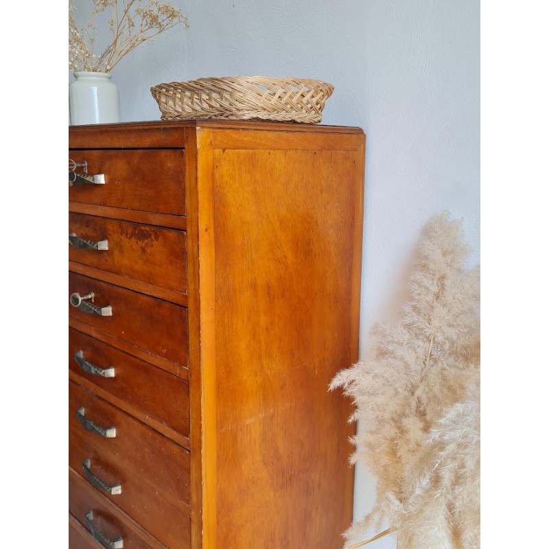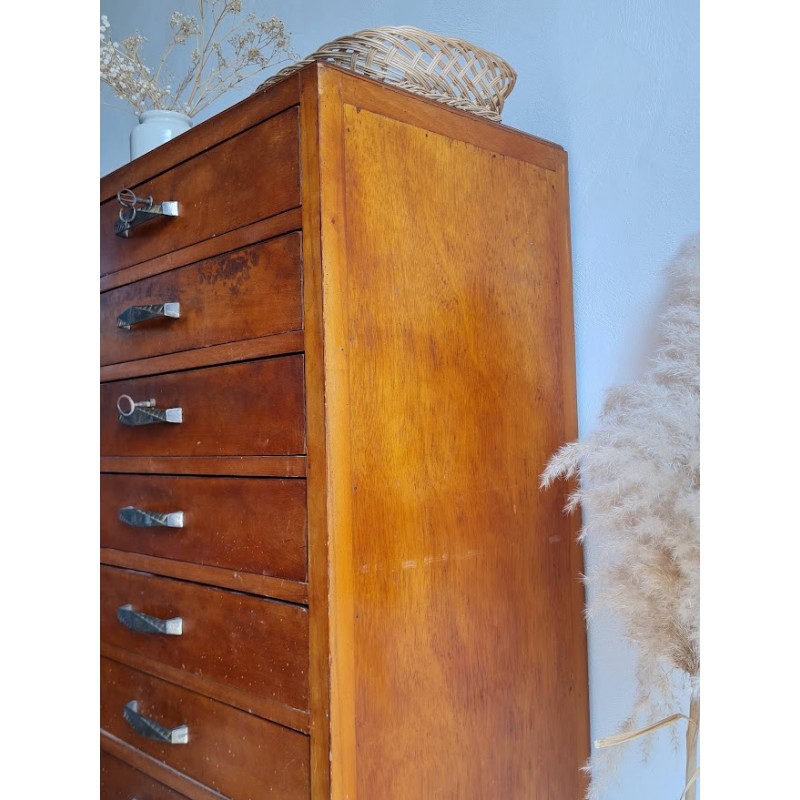 Semainier/commode art déco, élégant et pratique avec ses neuf tiroirs. Jolies poignées vintage d'origine. Le meuble ancien est piqué à plusieurs endroits, -ce qui est souvent le cas -, ( il a été traité par son ancienne propriétaire), à noter le dos a été un peu abimé de ce fait. Jolie patine.