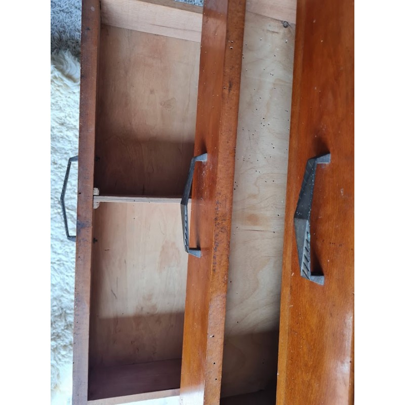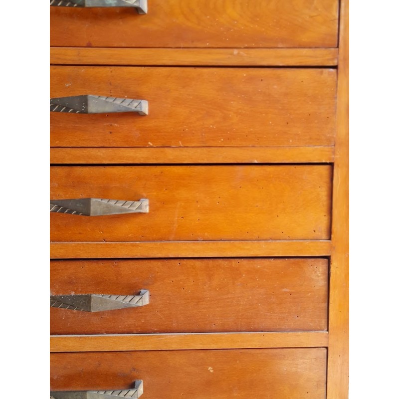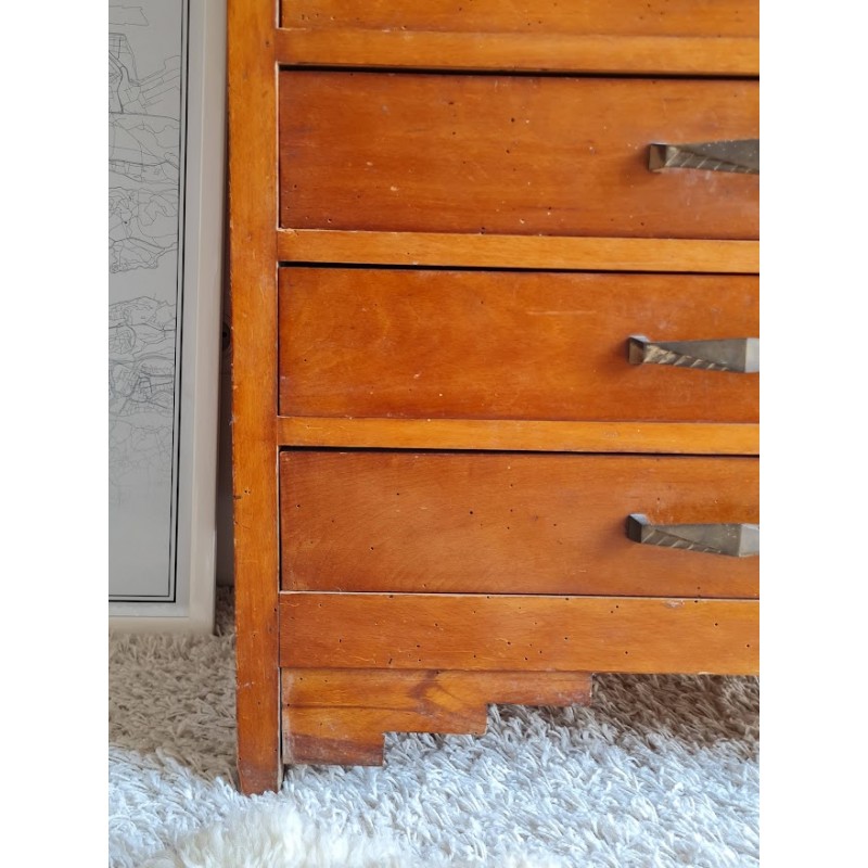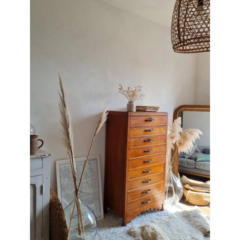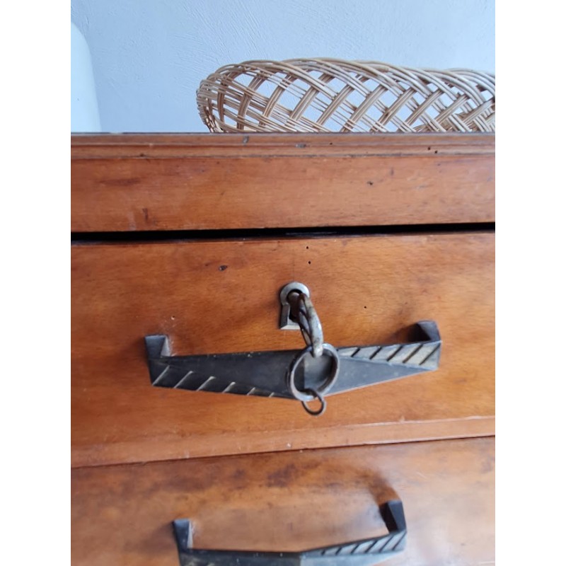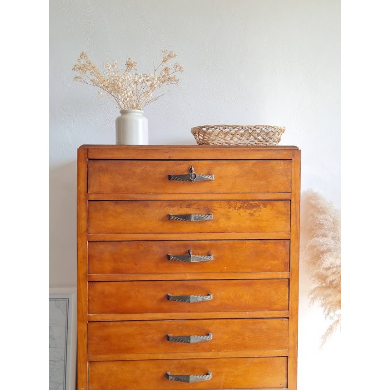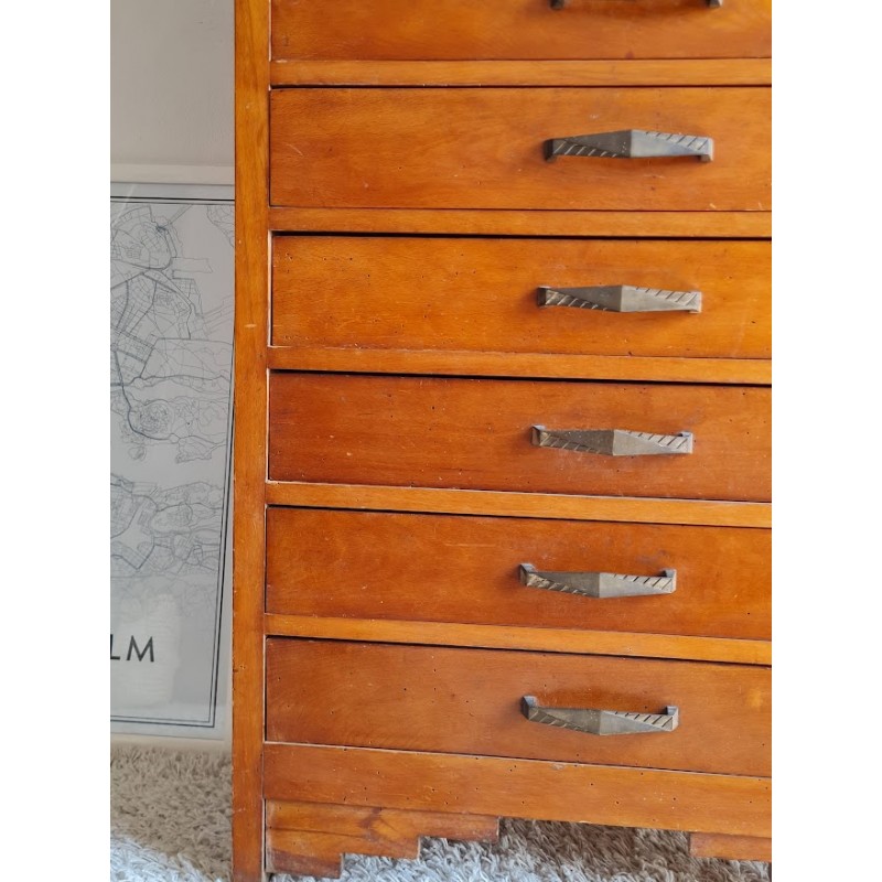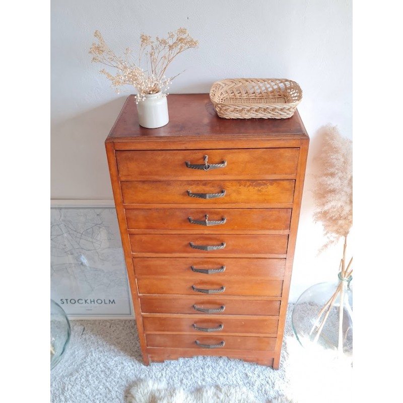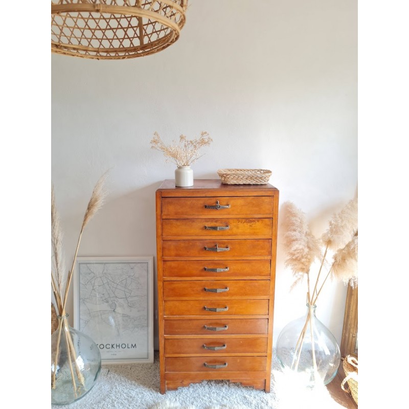 Semainier/commode art déco, élégant et pratique avec ses neuf tiroirs. Jolies poignées vintage d'origine. Le meuble ancien est piqué à plusieurs endroits, -ce qui est souvent le cas -, ( il a été traité par son ancienne propriétaire), à noter le dos a été un peu abimé de ce fait. Jolie patine.