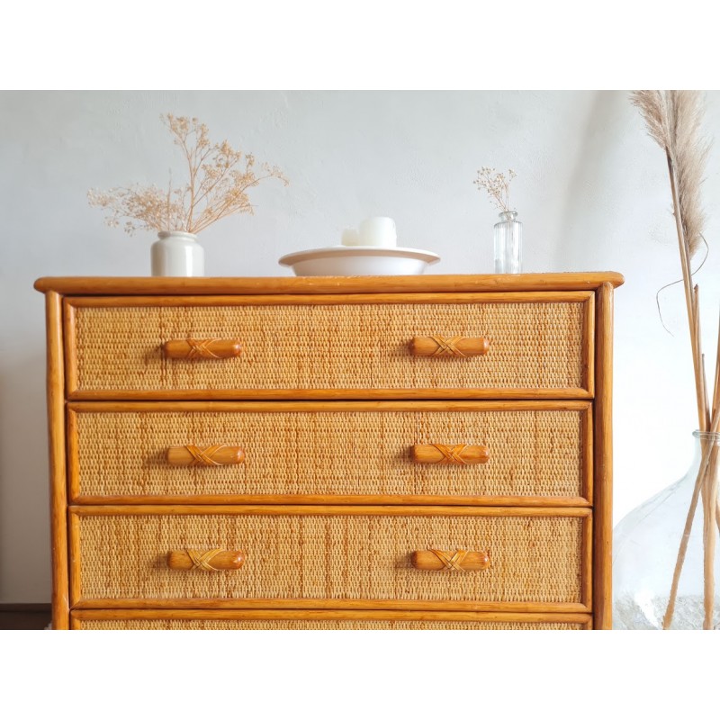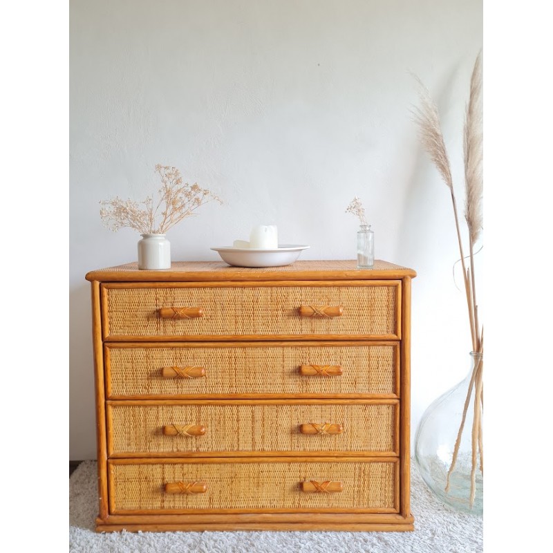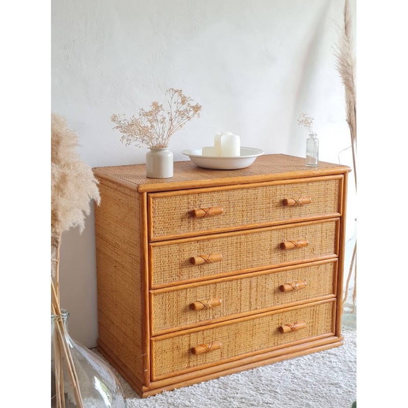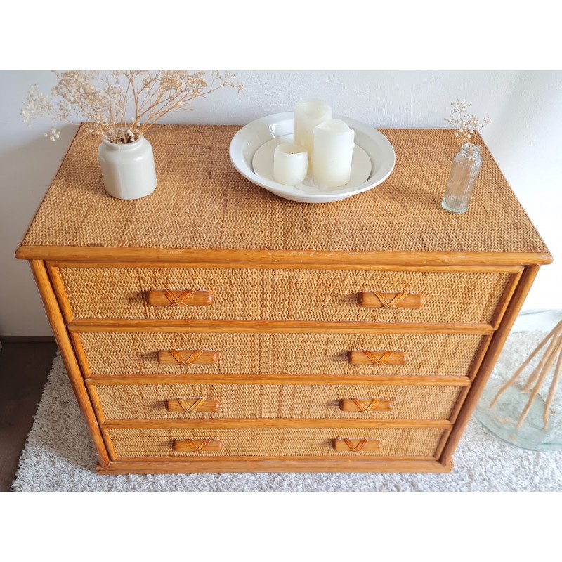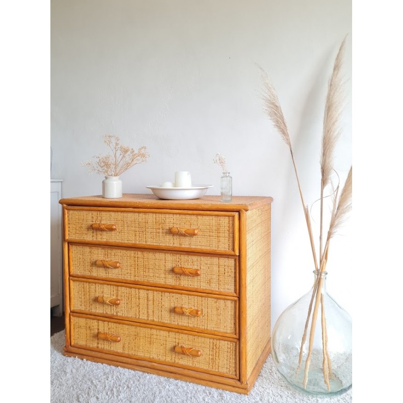Très jolie commode en rotin vintage. Belle patine dorée. Des traces de vies et imperfections visibles sur les photos. Les tiroirs accrochent un peu, mais vraiment rien de méchant. Beaucoup de charme et pratique avec ses 4 tiroirs. Idéale touche vintage. Dimensions: 47, 5 X L96, 5 X H 81