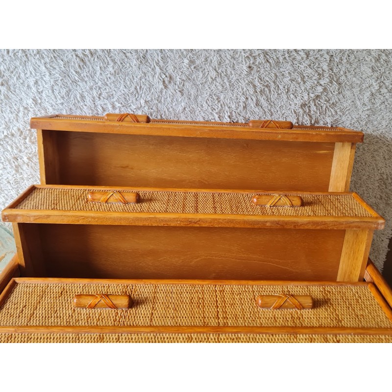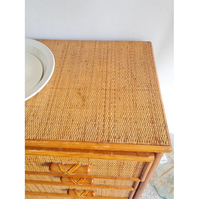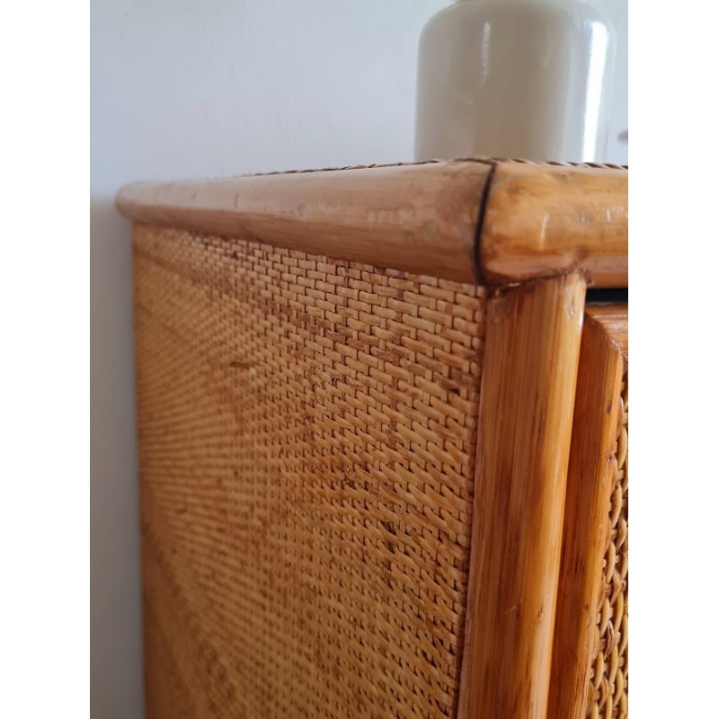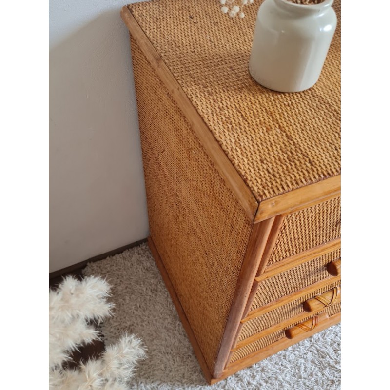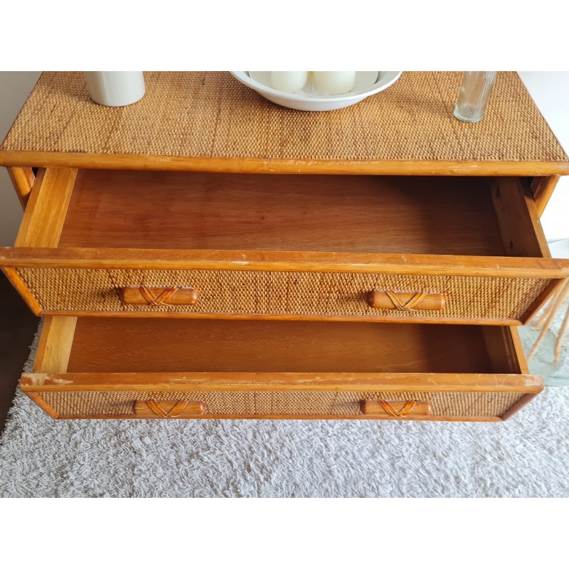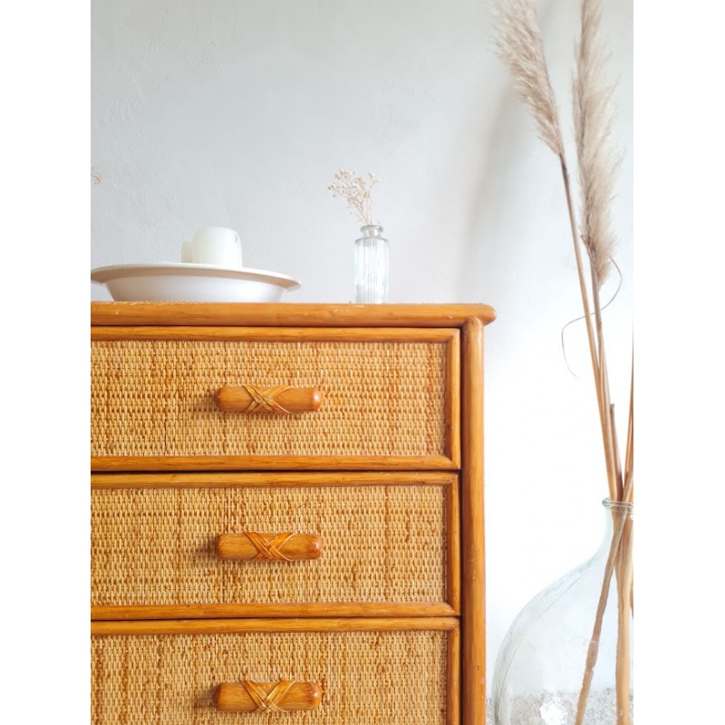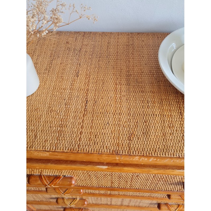 Très jolie commode en rotin vintage. Belle patine dorée.