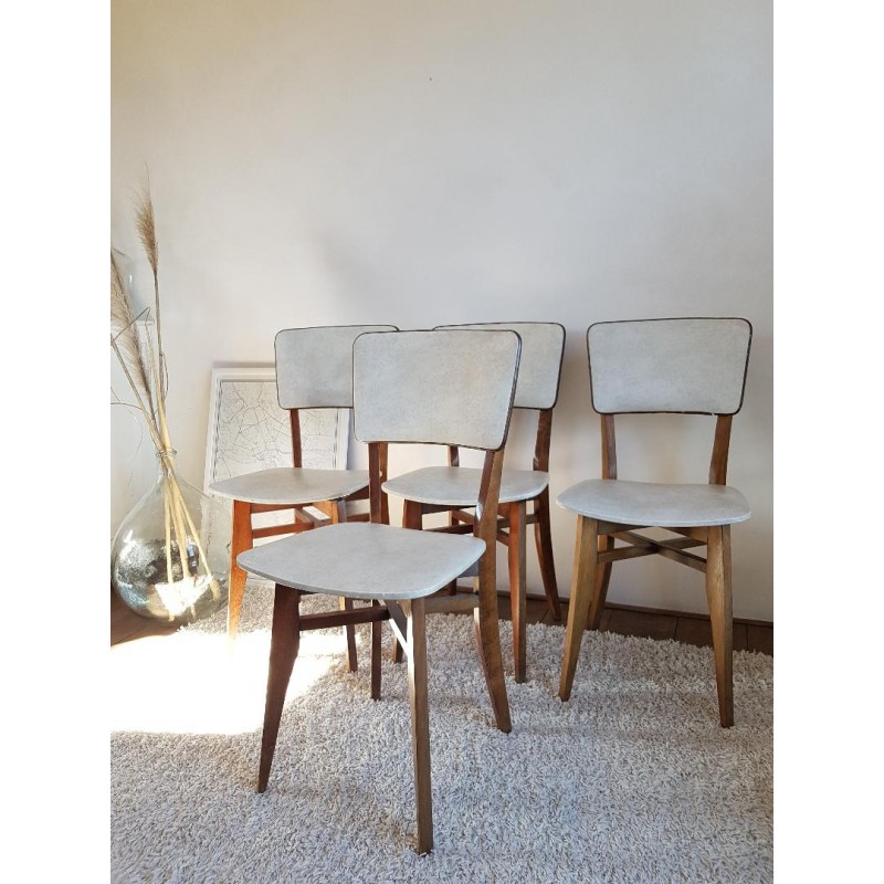 Suite de 4 chaises vintage années 60. Skai Blanc moucheté gris et piètement en bois avec une trés belle patine. Bon état, stables ( traces usures ou autres, visibles sur les photos).