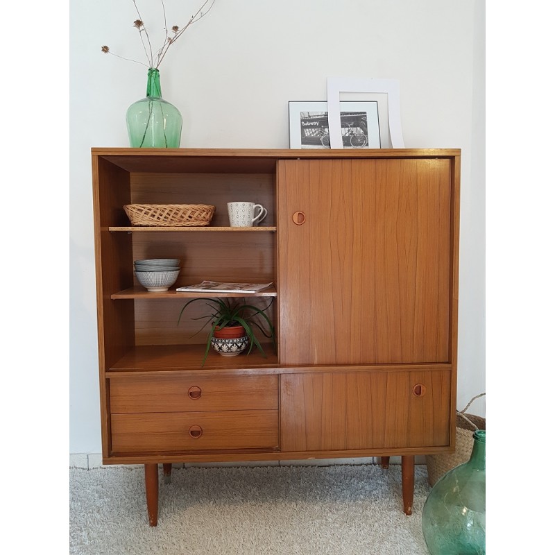 Beau buffet scandinave. Elégant et ultra fonctionnel avec son petit gabarit et ses nombreux rangements. Quelques traces du temps visibles sur les photos. Peut s'ouvrir sur la partie droite ou gauche, vitres en parfaites état.