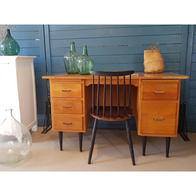 Superbe bureau années 60 en bois et piètement métal noir. Détails plein de charme et plutôt rare.