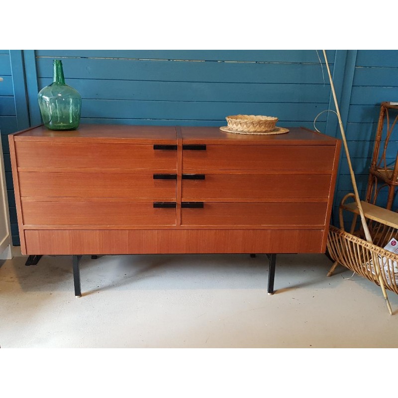 Superbe buffet moderniste circa années 60 aux lignes épurées, piètement et poignées métal noir. 6 tiroirs de facade dont l'un permet par un jeu de tablette de se transformeren coiffeuse, bureaud'appoint, etc. 3 petits tiroirs cachés. Produit rare. Ultra fonctionnel et facile à glisser avec son petit gabarit. Quelques traces usuelles, trés legers manquement visibles su r les photos mais bel état général. Stable.