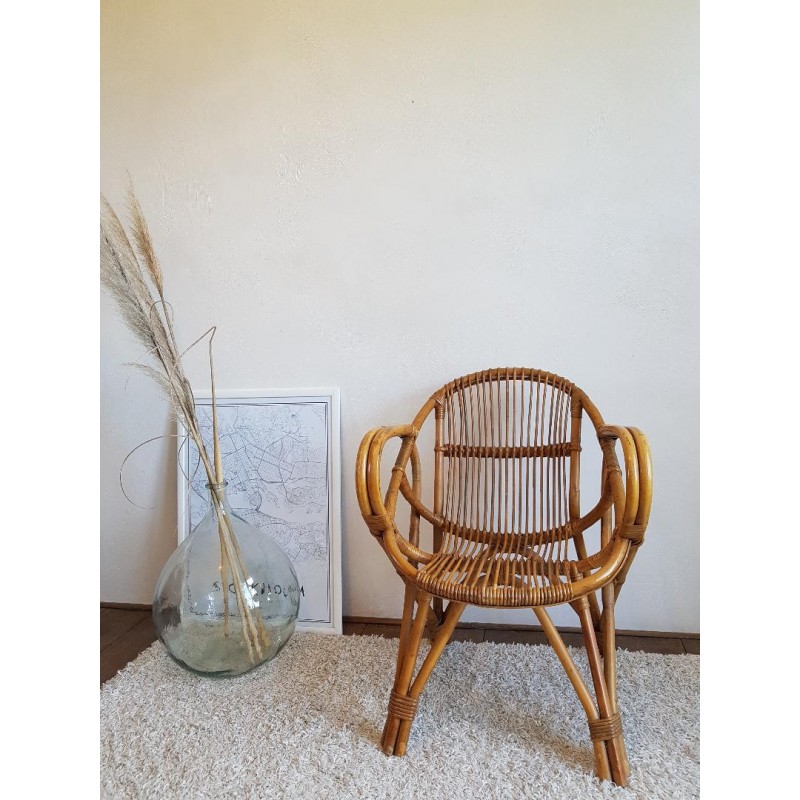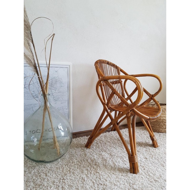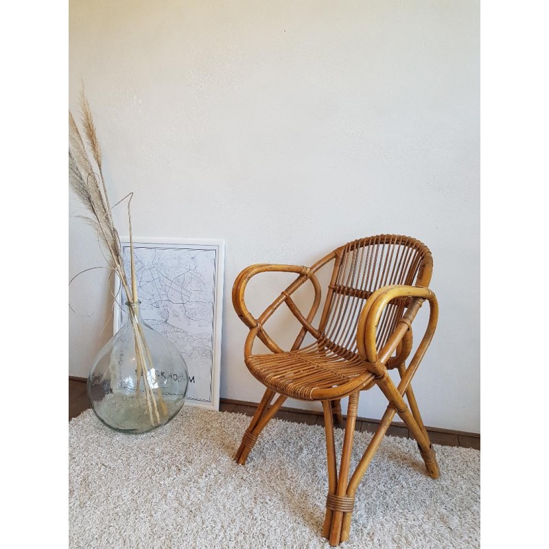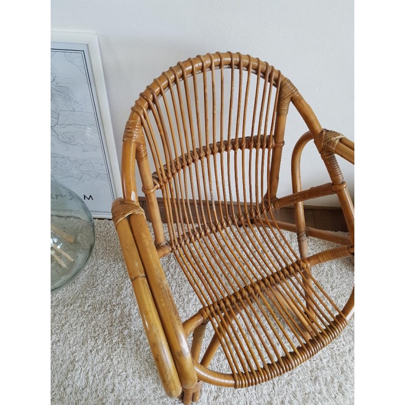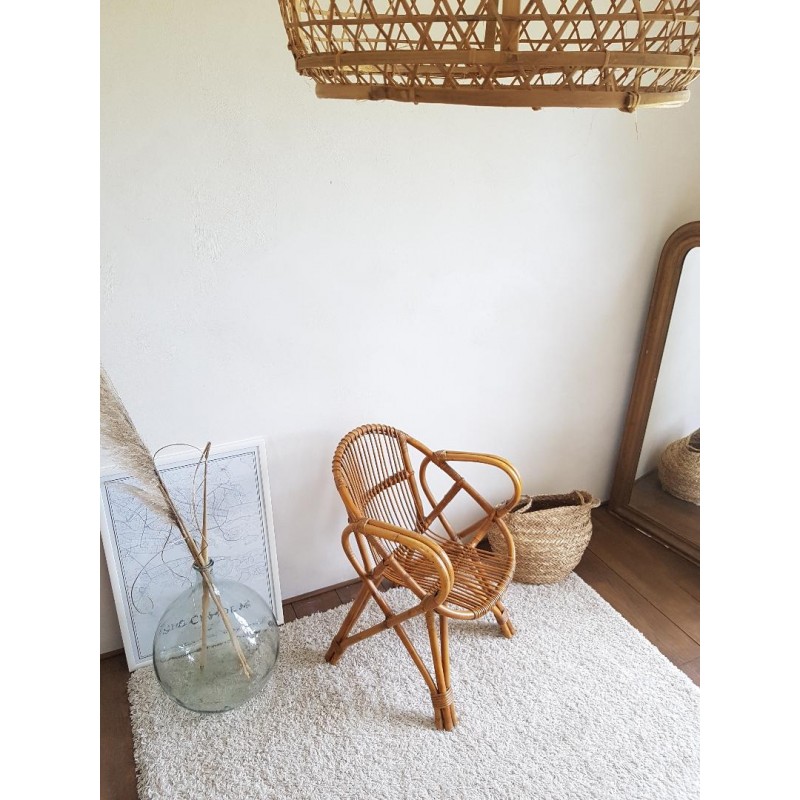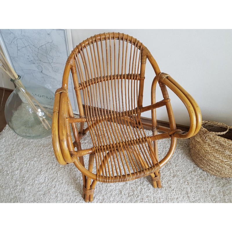 Superbe fauteuil en rotin vintage. Patine miel à tomber. Original avec ses pieds compas. Rare. Bel état général, cf photos (un brin dévié et quelques traces usuelles à signaler toutefois) .