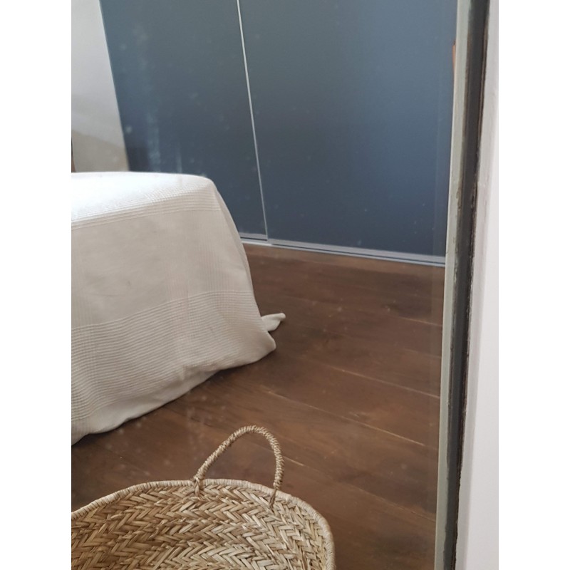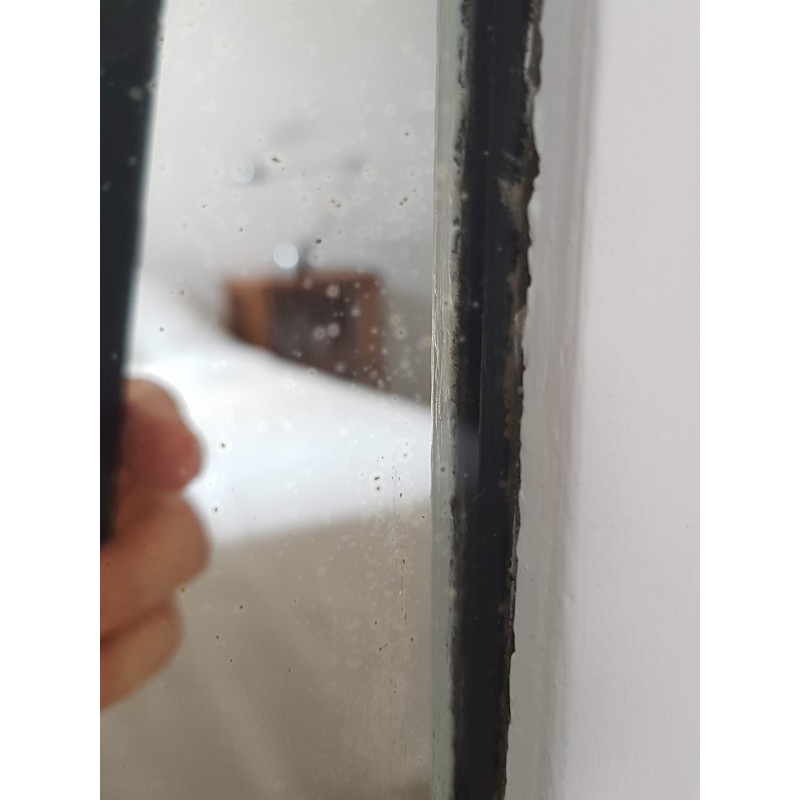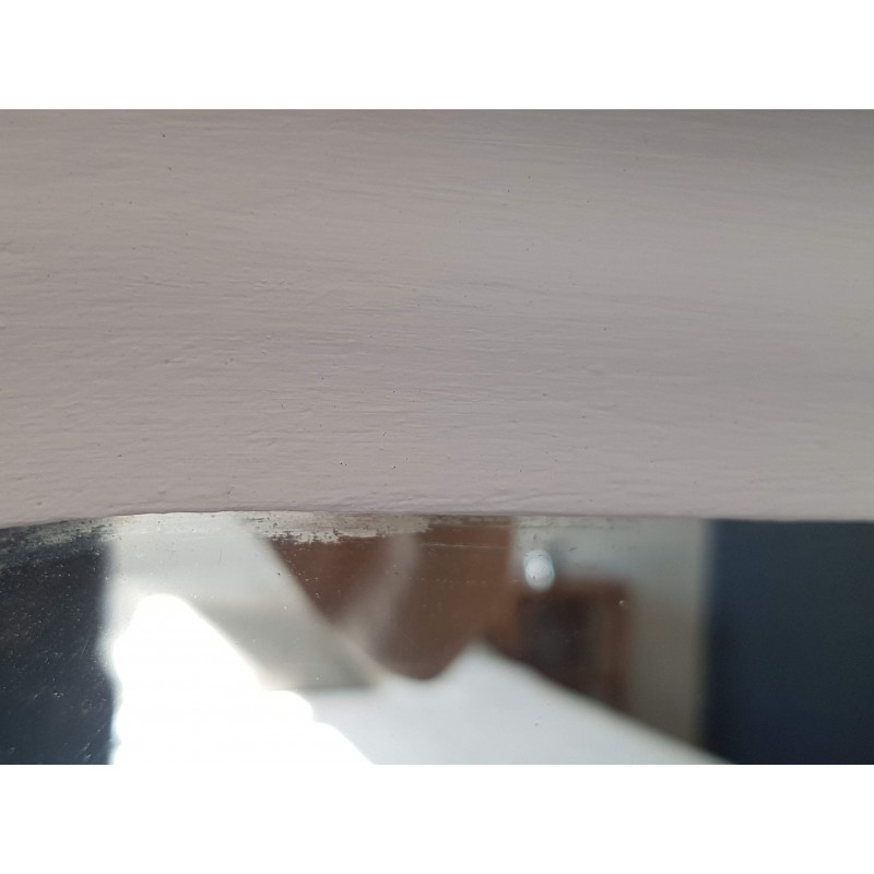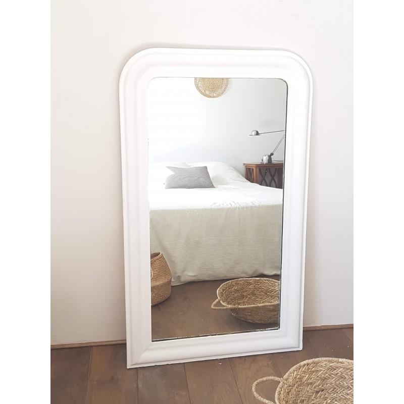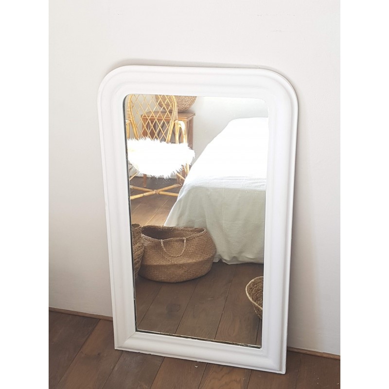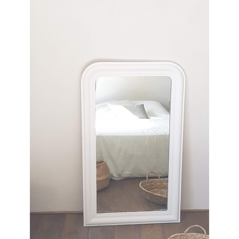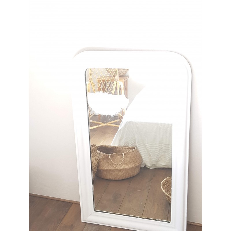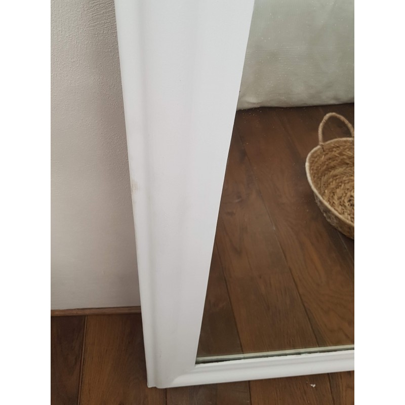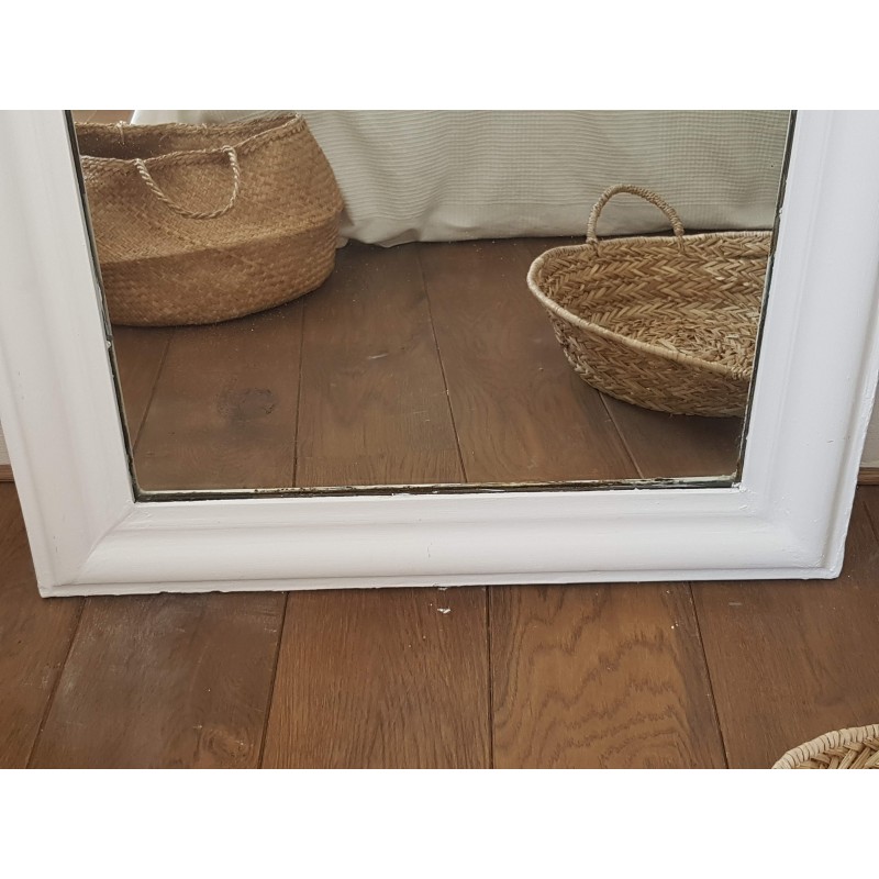 Très beau miroir ancien de style Louis Philippe repeint en blanc par son ancienne propriétaire. Des petites imperfections qui font son charme, la glace ancienne est piquée et des griffures à certains endroits (comme le sont souvent les glaces au mercure ancienne). Il est en bon état.