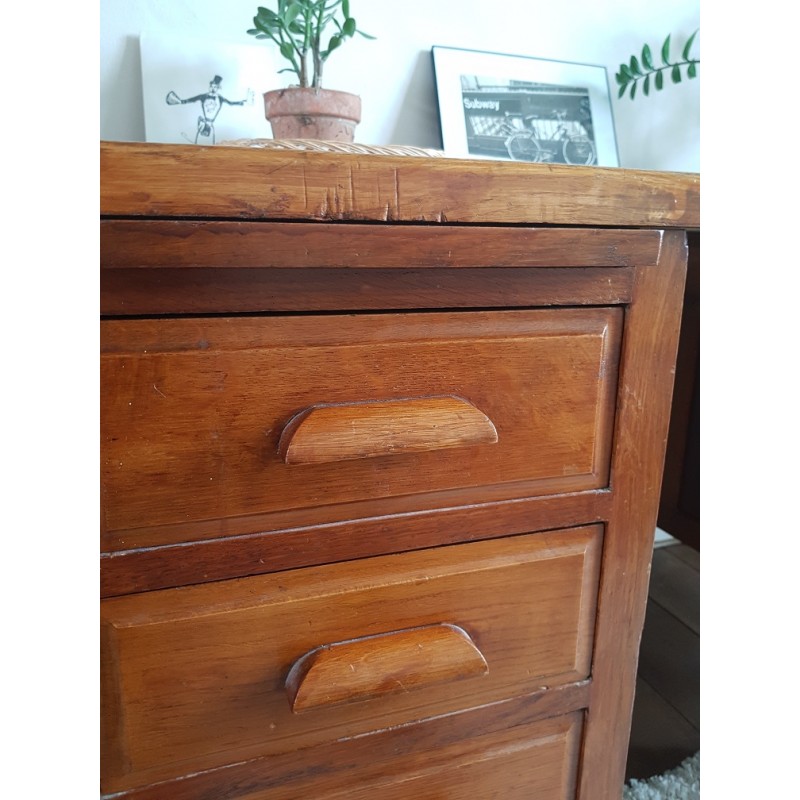 Superbe bureau (dit de ministre) circa années 60 en bois. 6 tiroirs qui coulissent aisément + une tablette par colonne. Bel état général, quelques traces de vies discrètes.