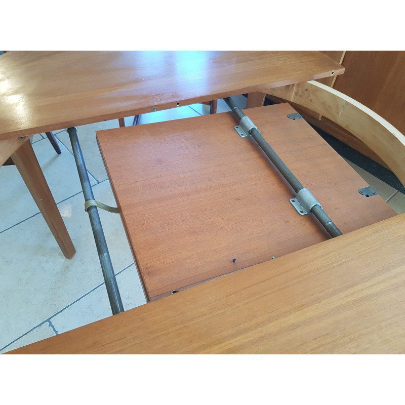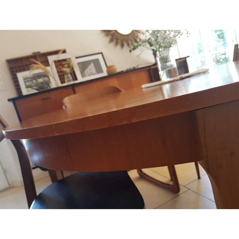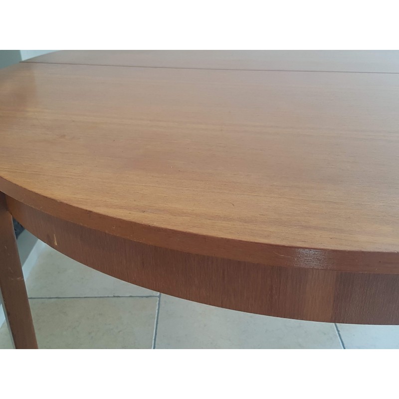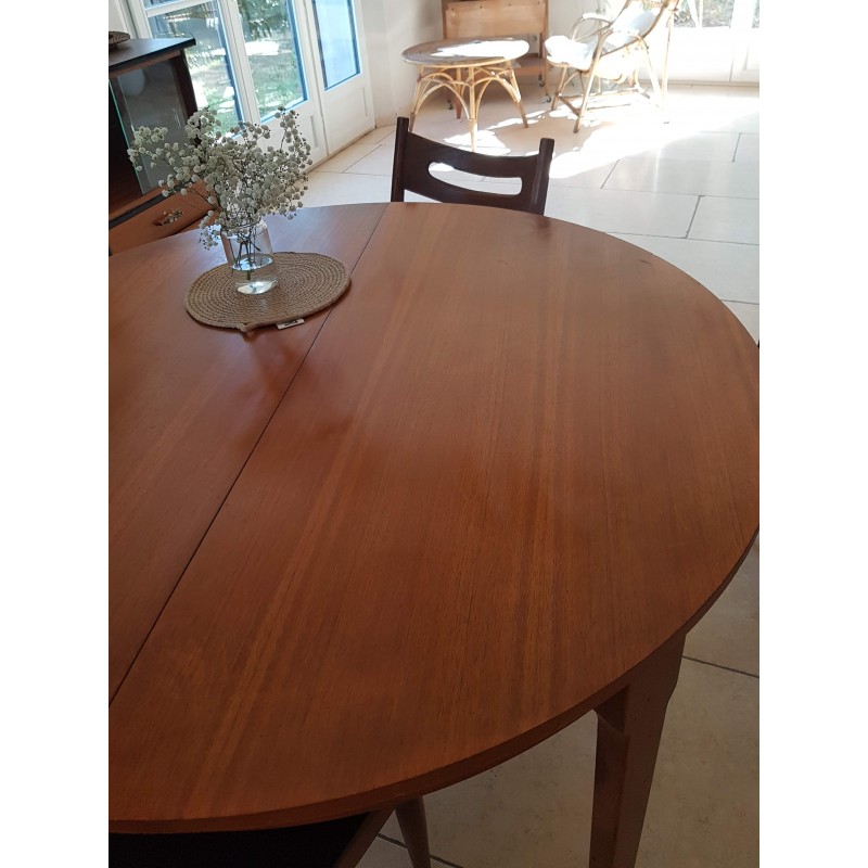 Table scandinave vintage avec rallonges papillons permettant de passer de 4 convives à 6/8. Trés fonctionnelle.Belle patine, des imperfections visibles sur les photos (petits manquements, griffures sur le plateau etc) pour ce meuble des années 60. Stable.
