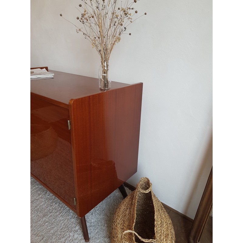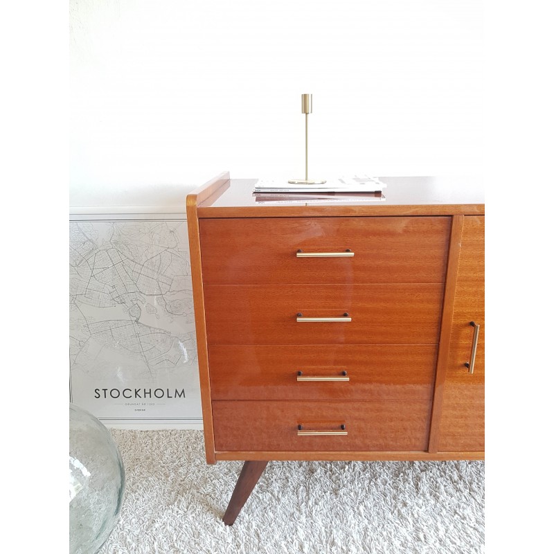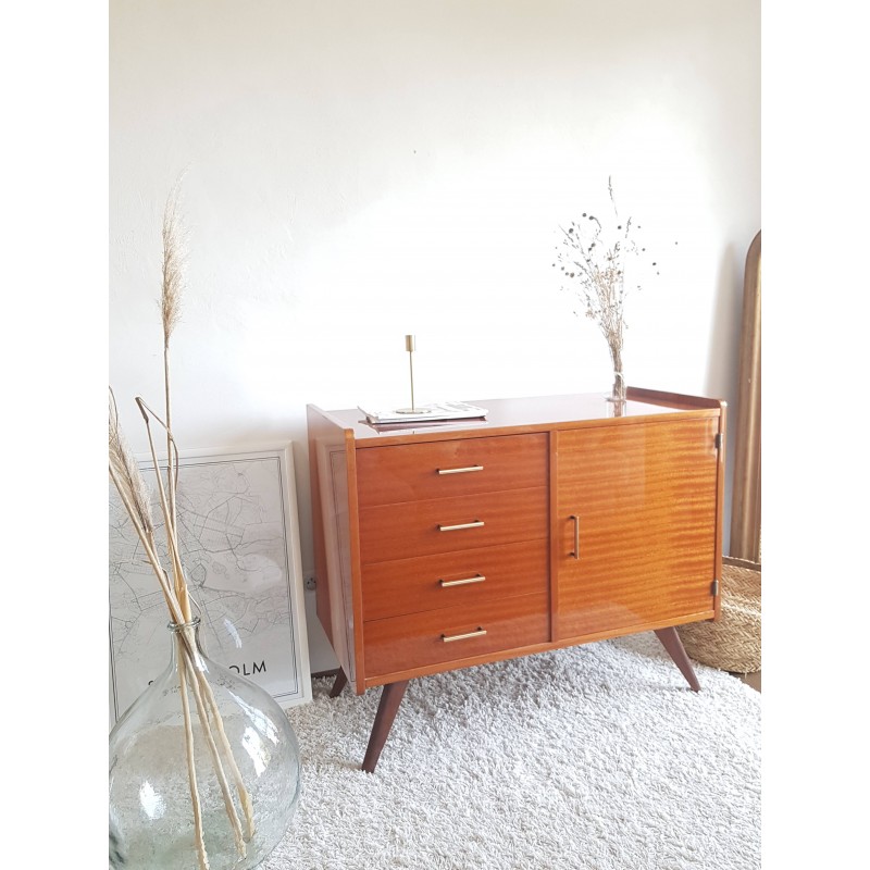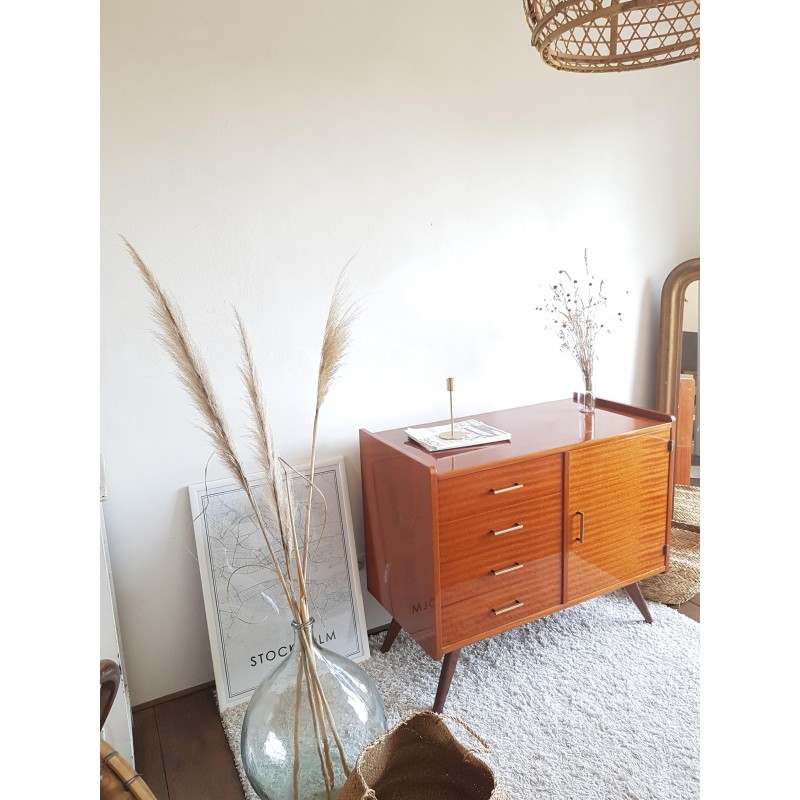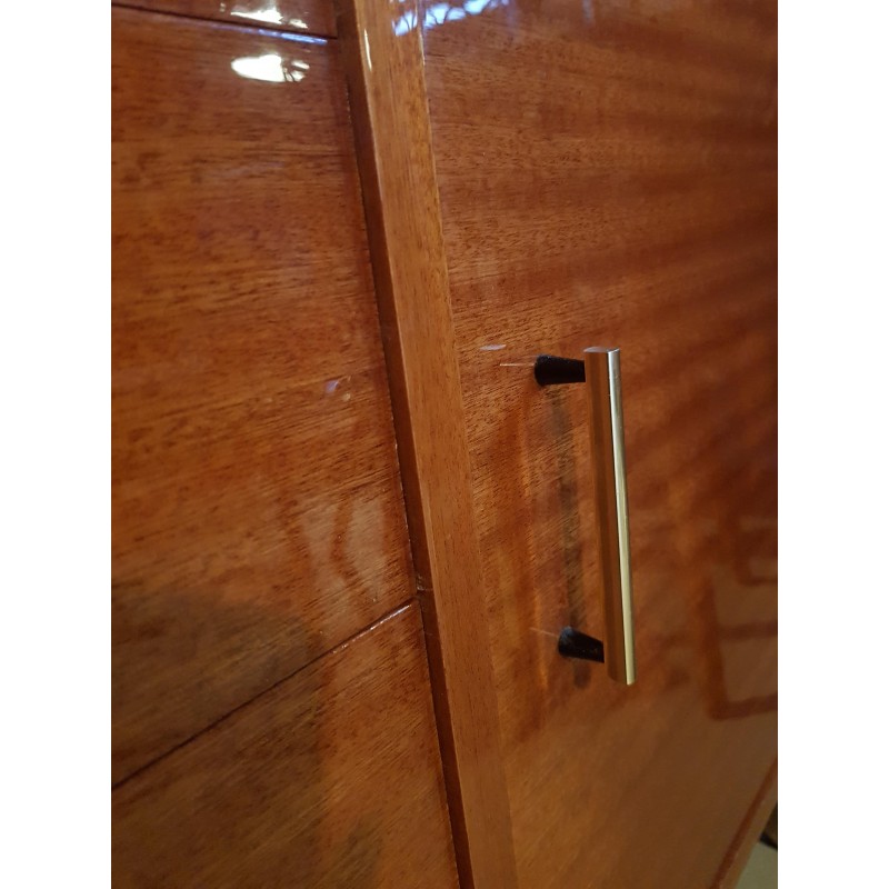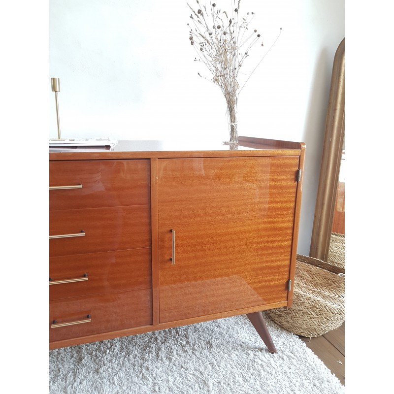 Superbe buffet, dans l'esprit petite enfilade, ou commode pieds compas. années 60. Etat extérieur en rare et excellent état de conservation (cf photos- à noter quelques traces intérieur placard). Très belle patine. Gabarit parfait. Poignées design (d'origine). Très bonne qualité.