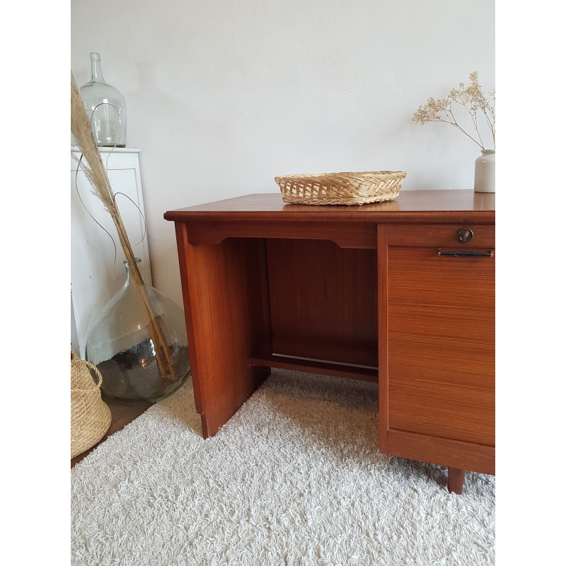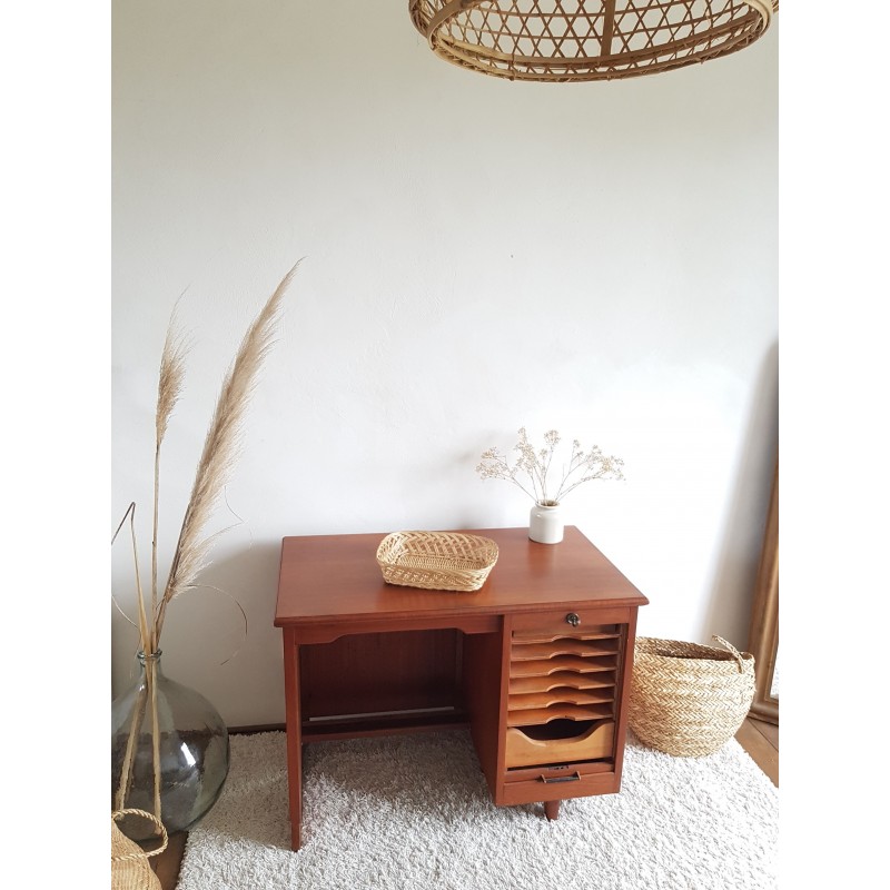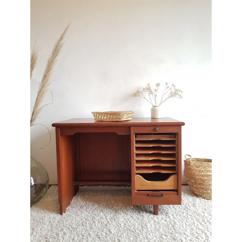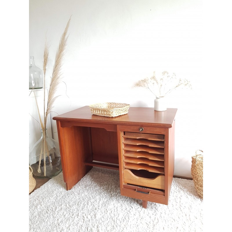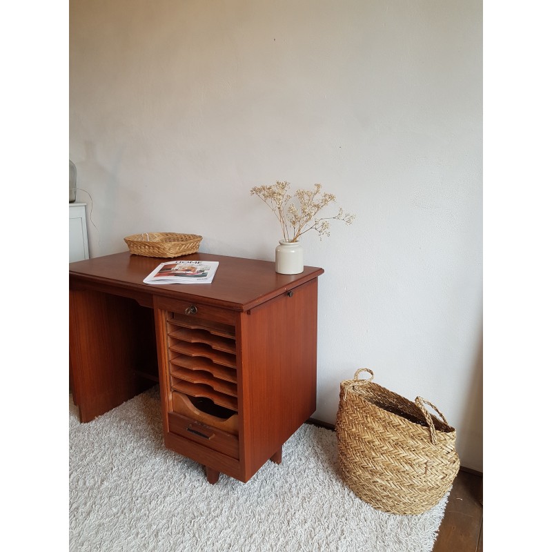 Bureau ancien de métier années 50. Très belle patine très chouette avec ses tiroirs, casiers et tablettes de chaque coté. Petites imperfections visibles les photos, mais bel état général. Stable. Énormément de cachet.