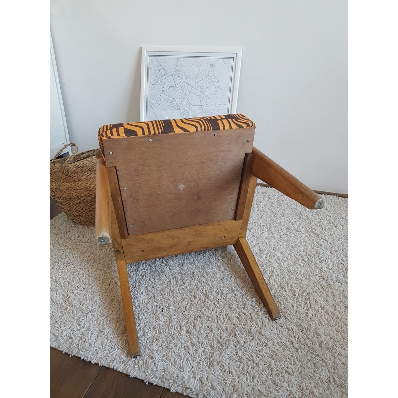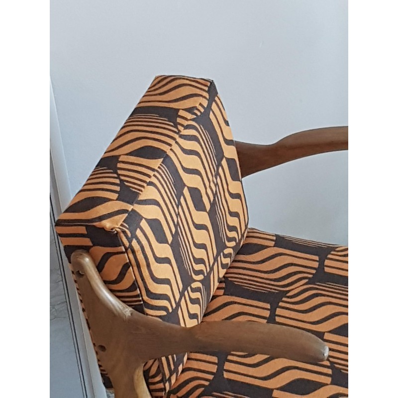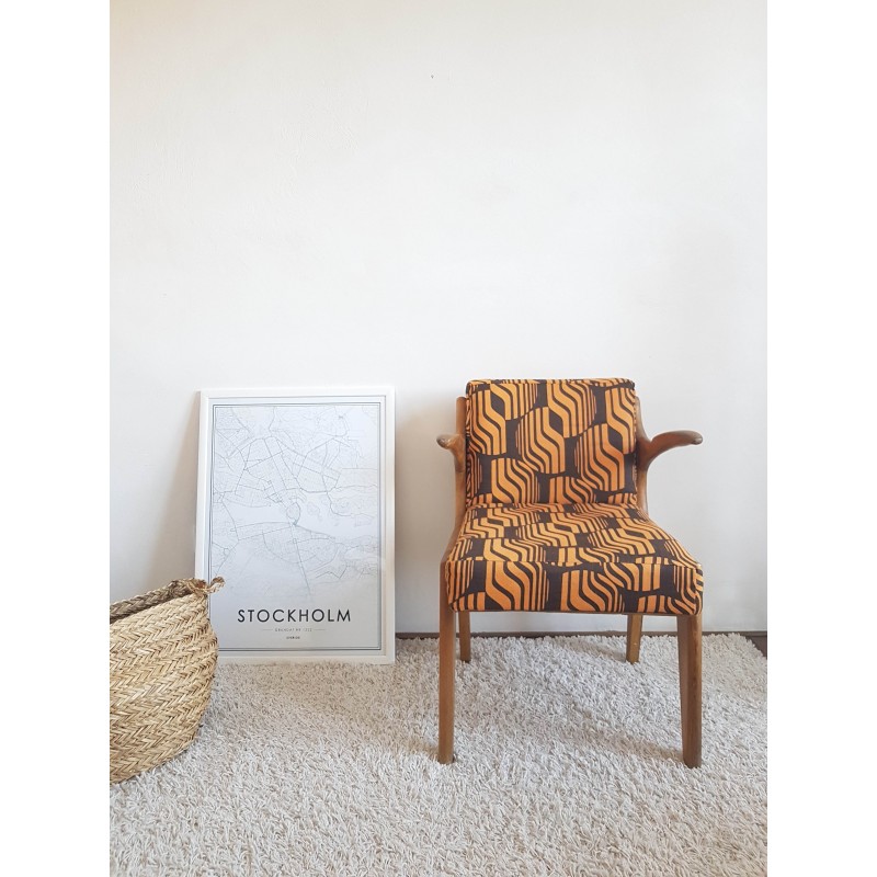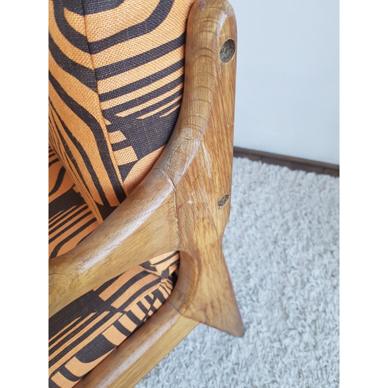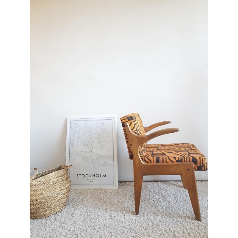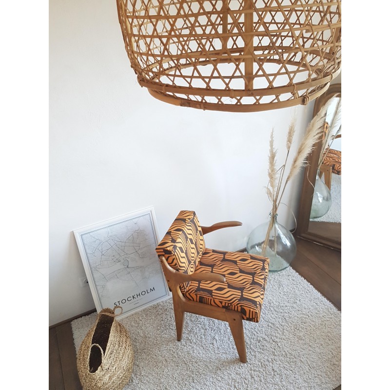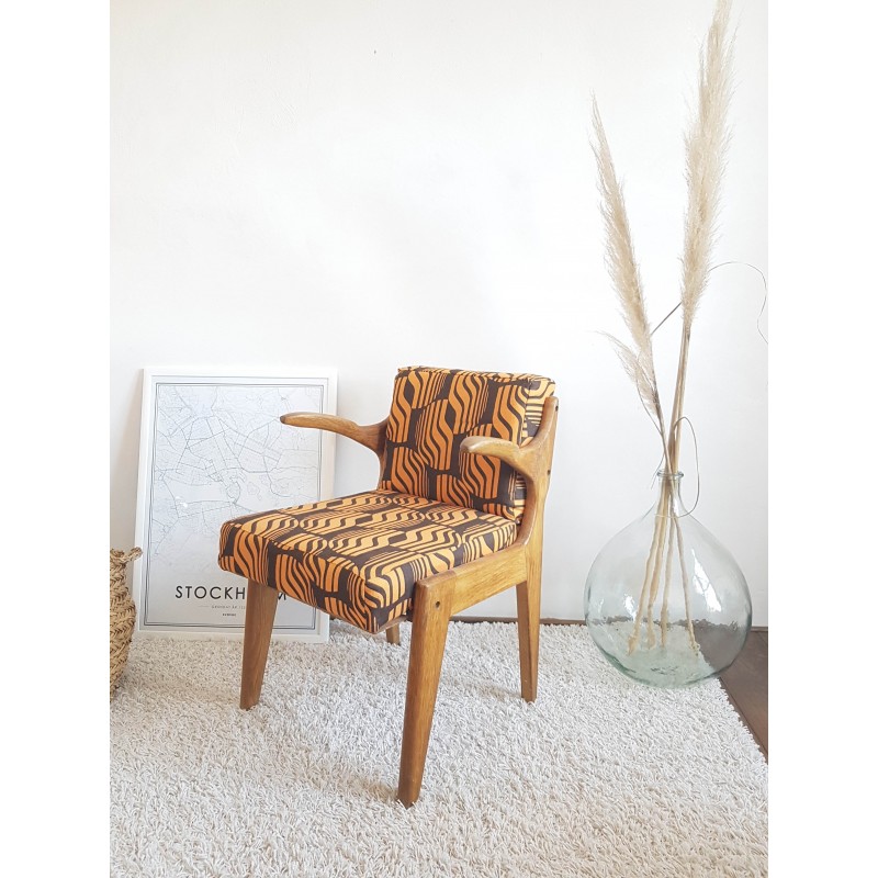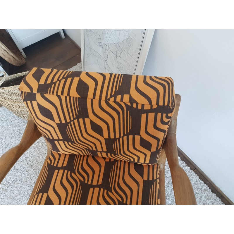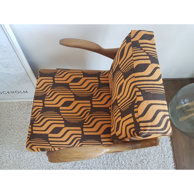 Très beau fauteuil scandinave ré-houssé avec un tissus vintage par une couturière. Superbes lignes, très confortable. Jolie patine. Stable.