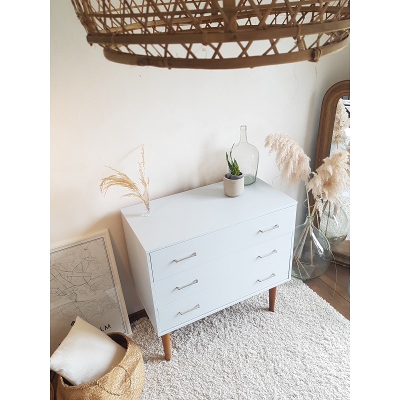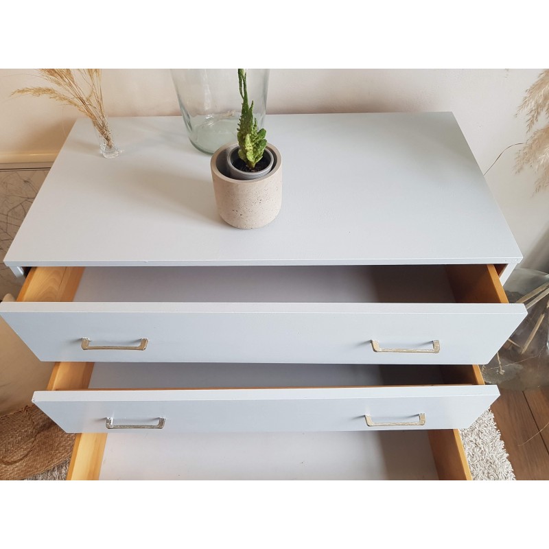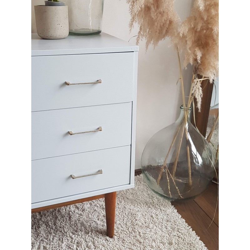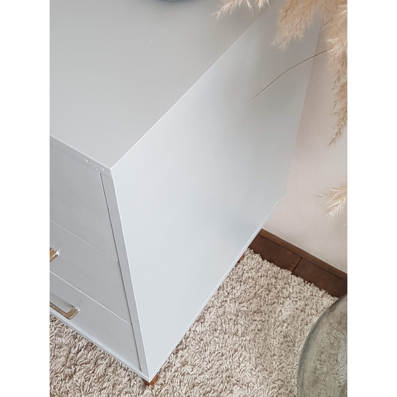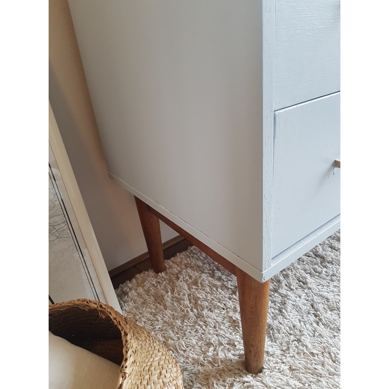 Belle commode années 70, dans l'esprit scandinave, peinte en gris clair par son ancienne propriétaire. Les tiroirs coulissent bien. Quelques petites imperfections visibles sur les photos. Bel état général. Stable.