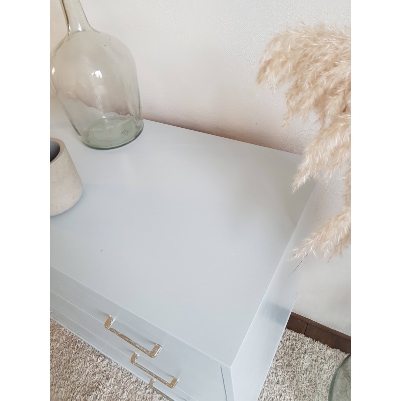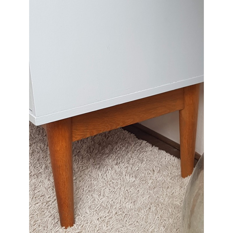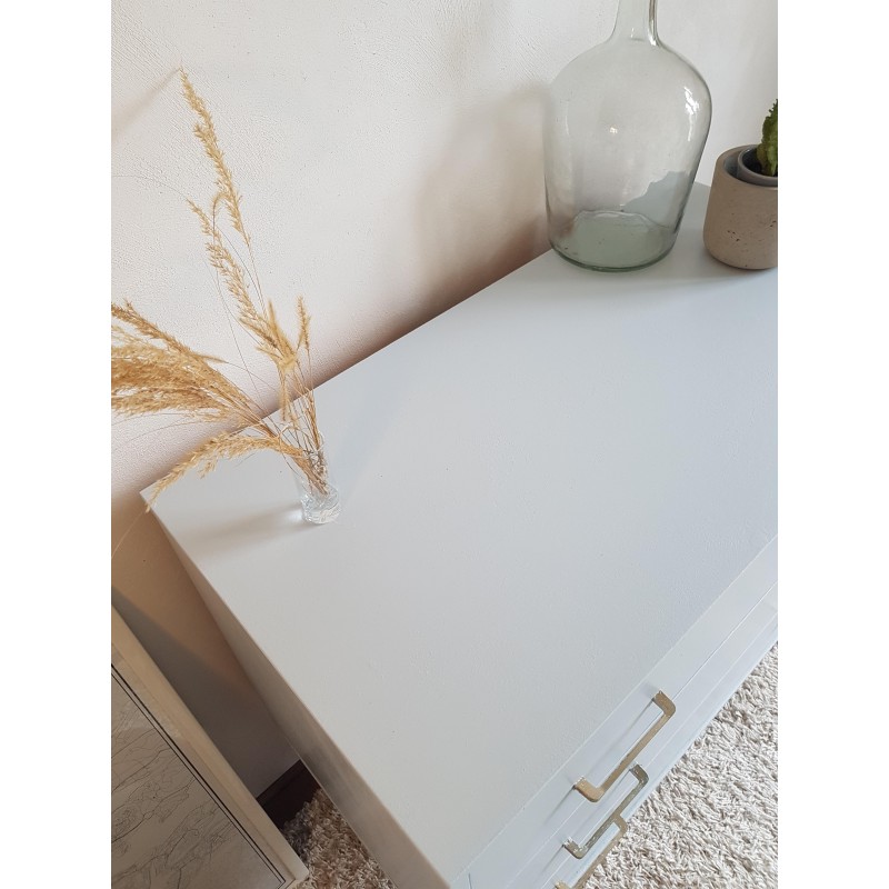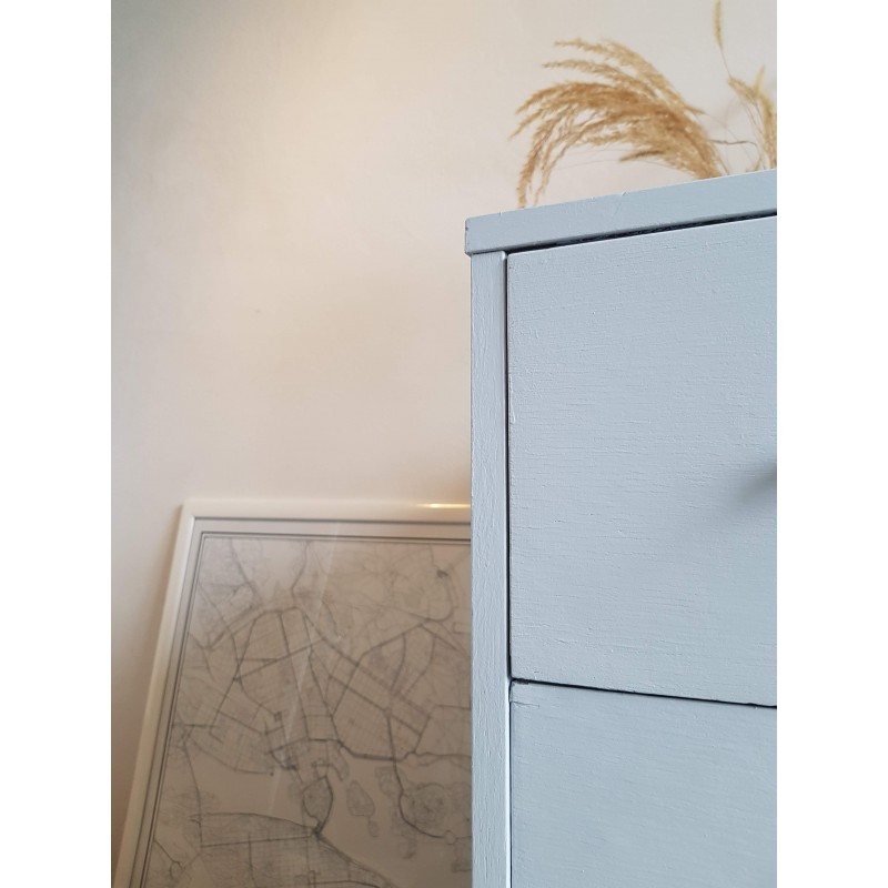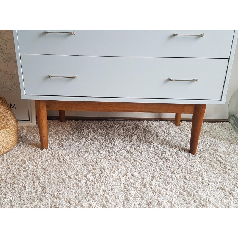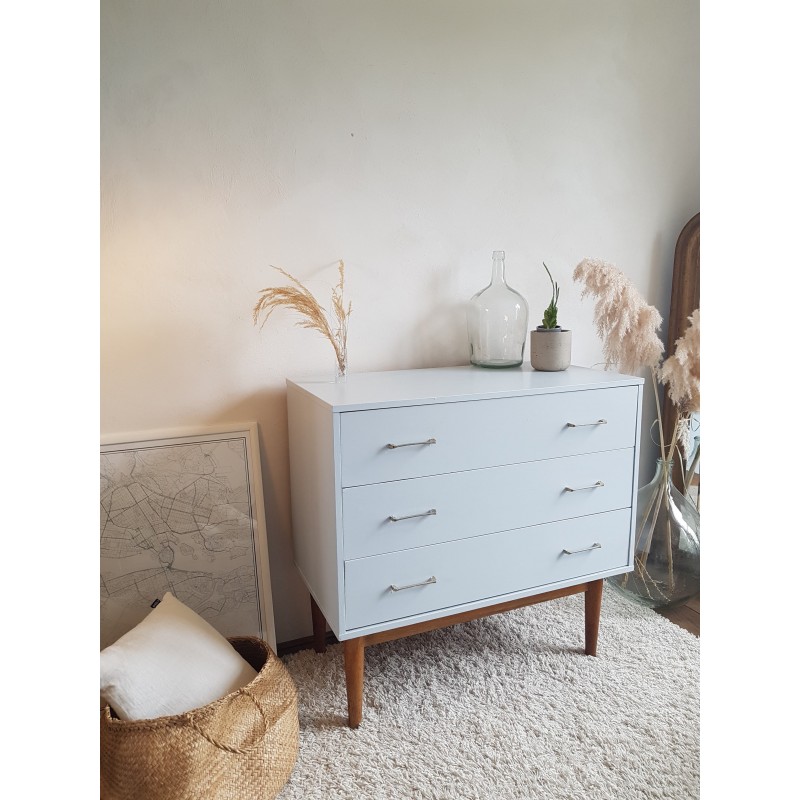 Belle commode années 70, dans l'esprit scandinave, peinte en gris clair par son ancienne propriétaire. Les tiroirs coulissent bien. Quelques petites imperfections visibles sur les photos. Bel état général. Stable.