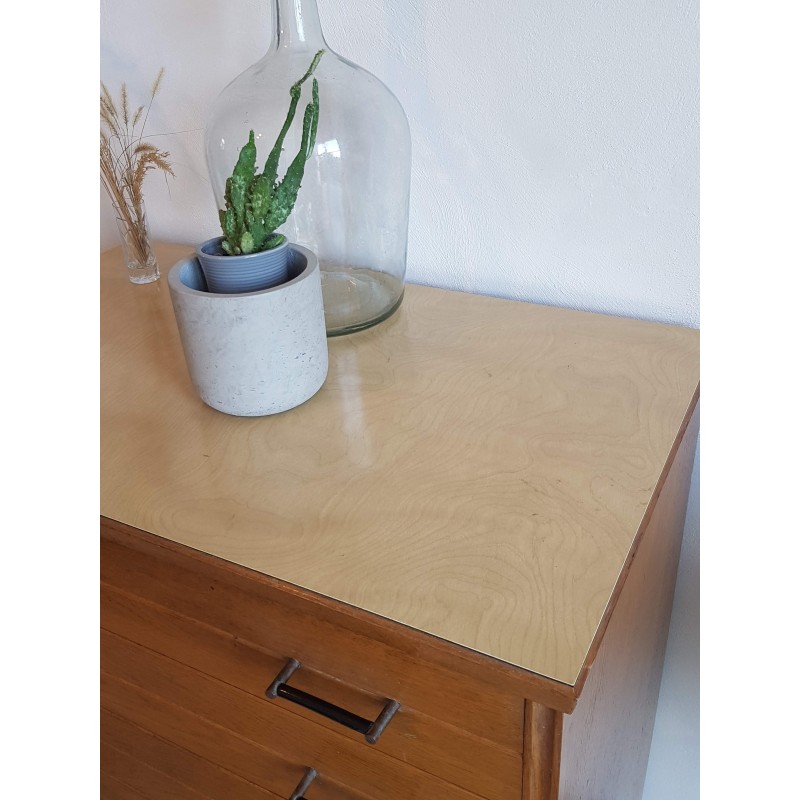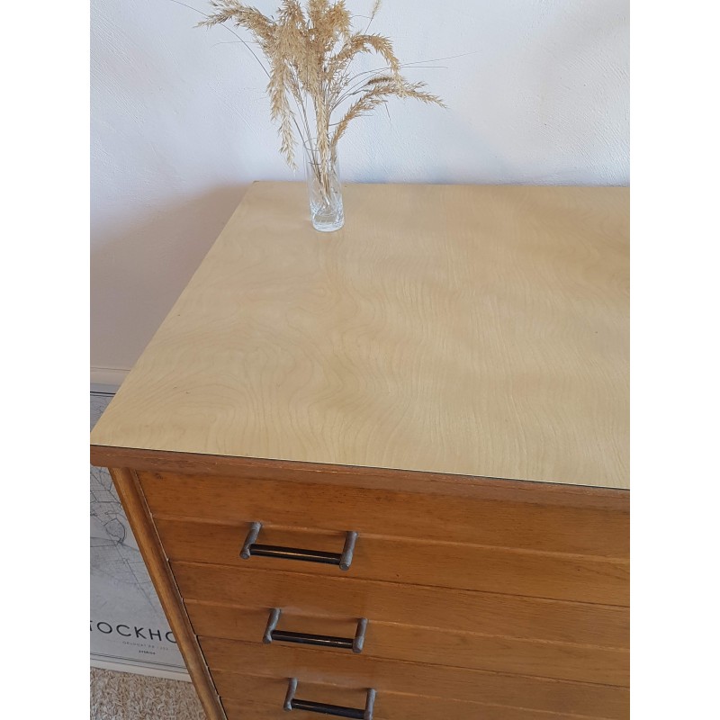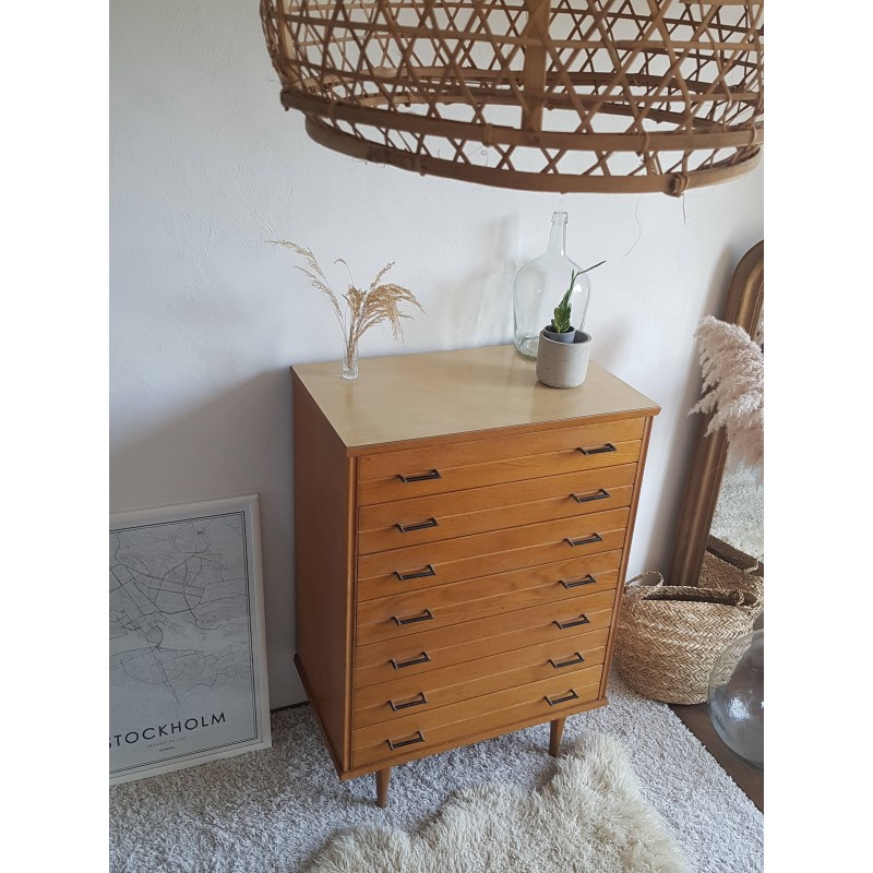Orginale, de bonne facture, raffinée avec ses moulures sur chaque tiroir et par ailleurs sobriété des lignes dans l'esprit scandinave. Très beau meuble vintage, à la fois très fonctionnel et peu commun.
