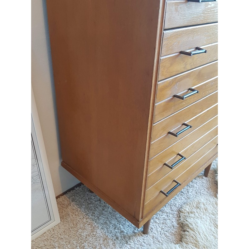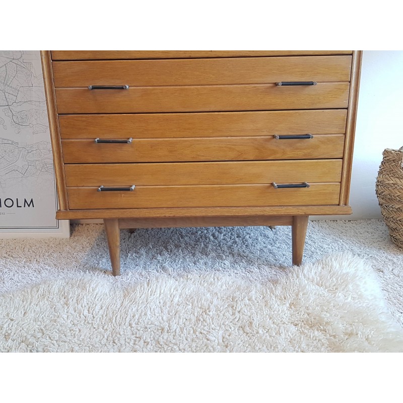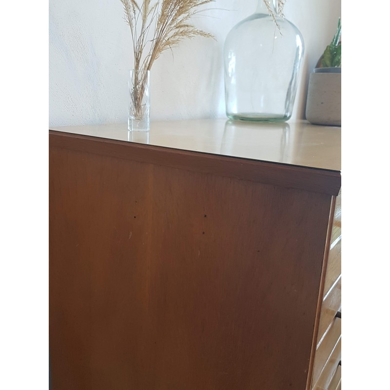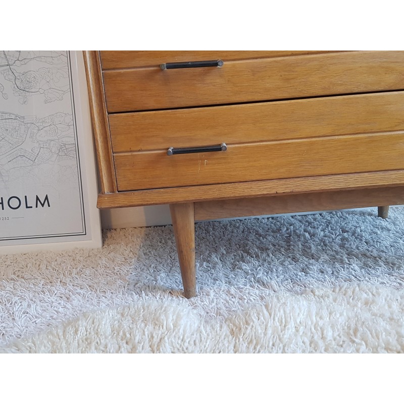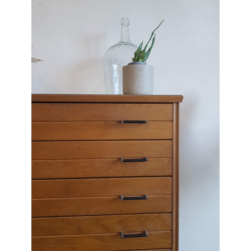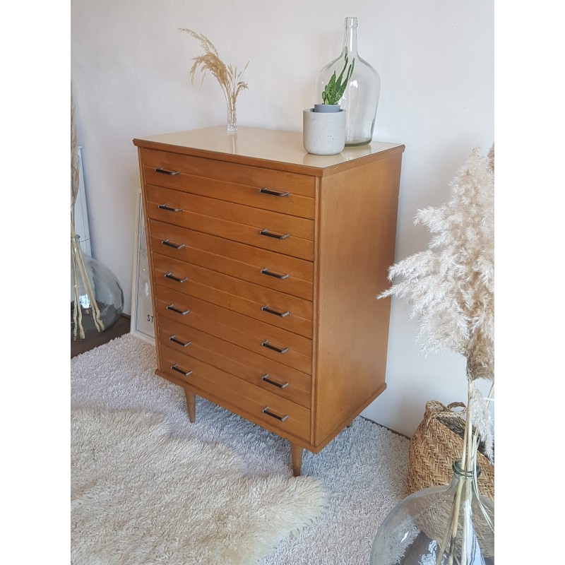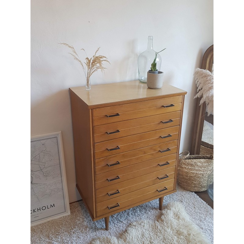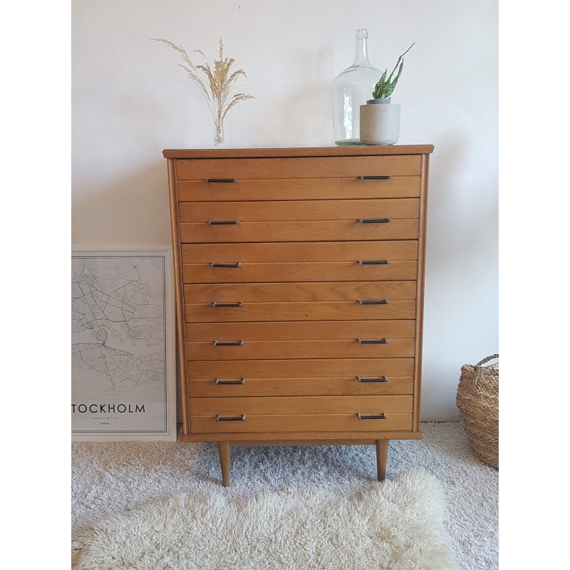 Superbe commode années 60 avec 7 tiroirs. Bel état général, stable. L'ensemble des tiroirs coulissent parfaitement. Quelques rares petites imperfections. A noter 2 crochets avait été fixe sur le côté, il reste de 2X2 petits trous de fixation.