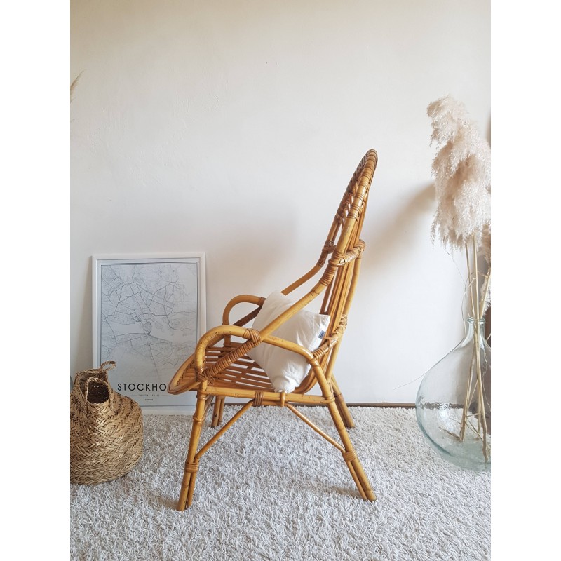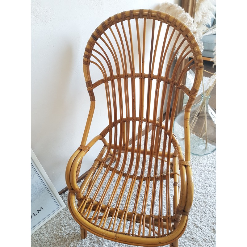 Superbe fauteuil en rotin vintage, forme corbeille dossier haut.