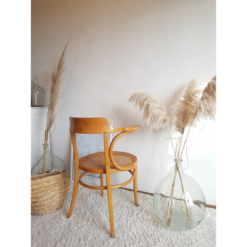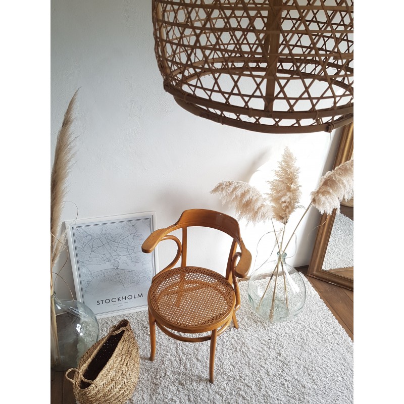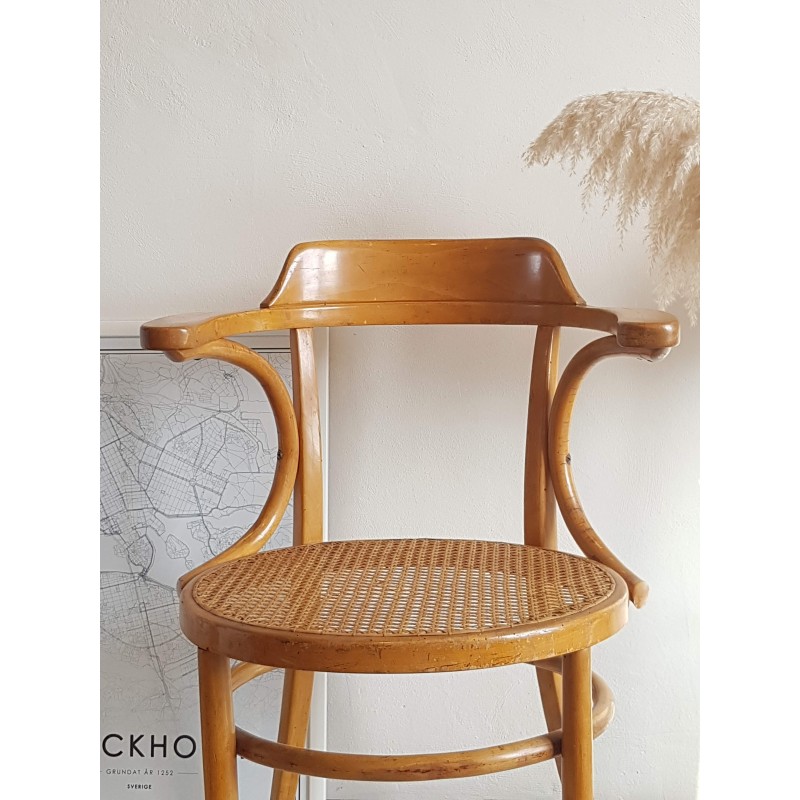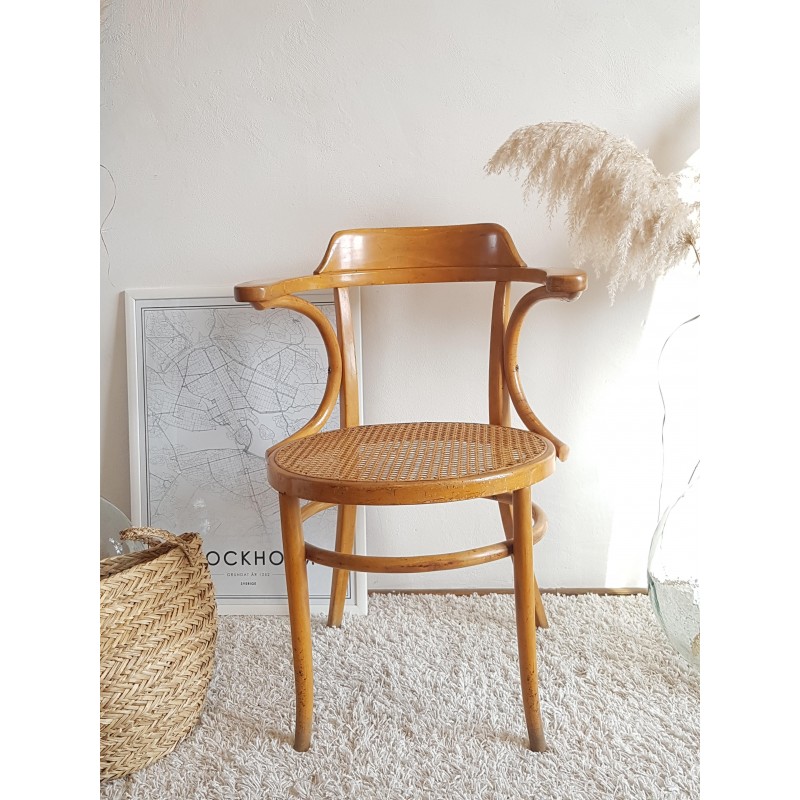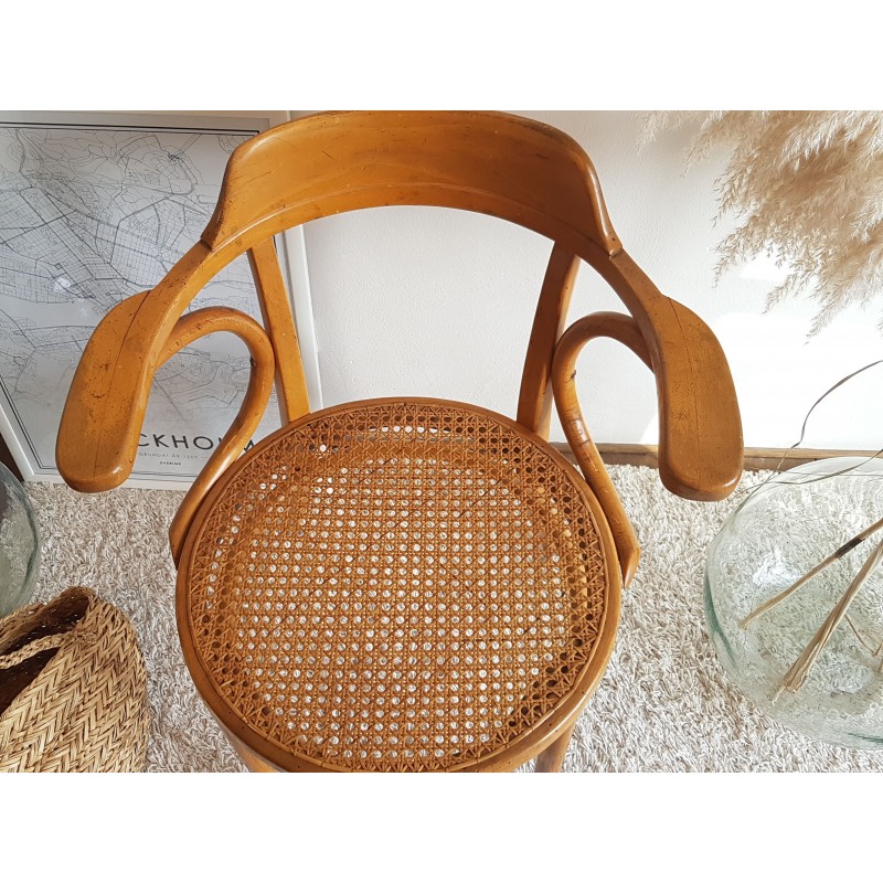 Très beau fauteuil "Japy Frères" canné. Superbe patine miel doré. Très bon état du cannage. Chouette travail de bois courbé pour ce concurrent si prisé de Thonet.