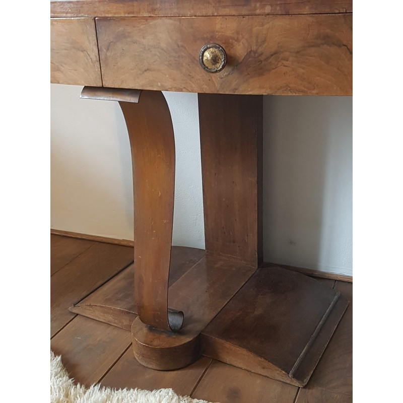 Superbe coiffeuse de style art déco circa 1930. Lignes sobres, raffinées et avec une belle singularité. Structure bois et métal (sur lequel repose le devant).La finesse du pieds avant donne de la mobilité au meuble (avant: arrière/latérale).des imperfections, traces de vies etc visibles sur les photos (miroir et meuble).Le tiroir de droite s'ouvre aisément, moins d'aisance sur le deuxième.