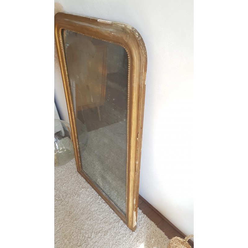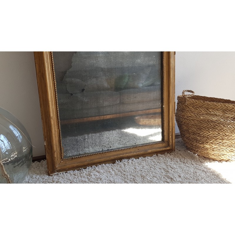 Superbe miroir Louis Philippe. Incroyable patine du tain. La réflexion est partielle. C'est assez rare, on voit l'évolution du miroir des taches grisées jusqu'à la transparence qui permet de voir (ré)apparaître le plancher.
