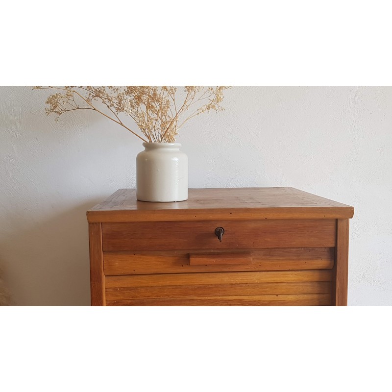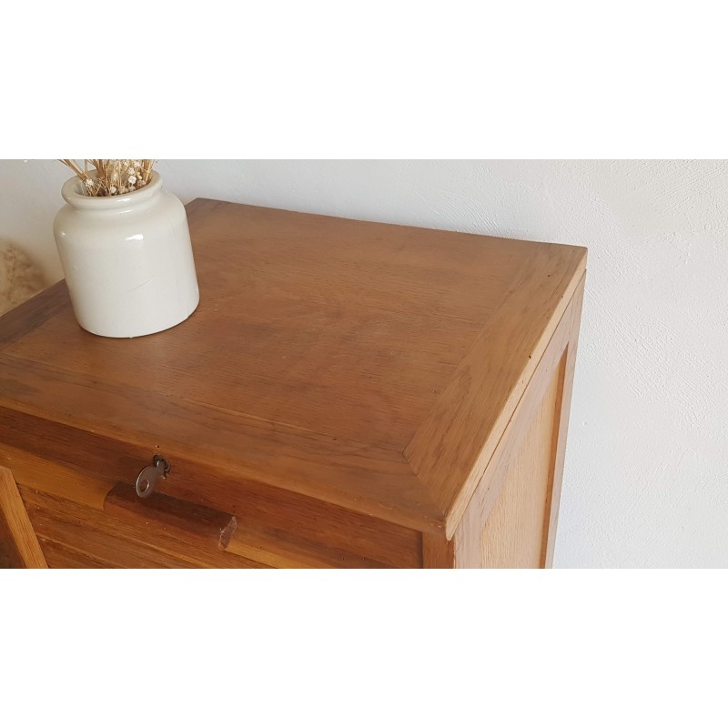 Très beau meuble de métier, classeur à rideau, avec sa clé d'origine ( circa années 60). Jolie patine miel doré.