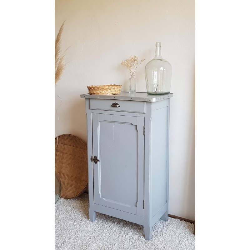 Beaucoup de charme pour ce confiturier ancien, repeint en gris par son ancien propriétaire. Des imperfections visibles sur les photos (les deux étagères semblent plus récentes). Stable.