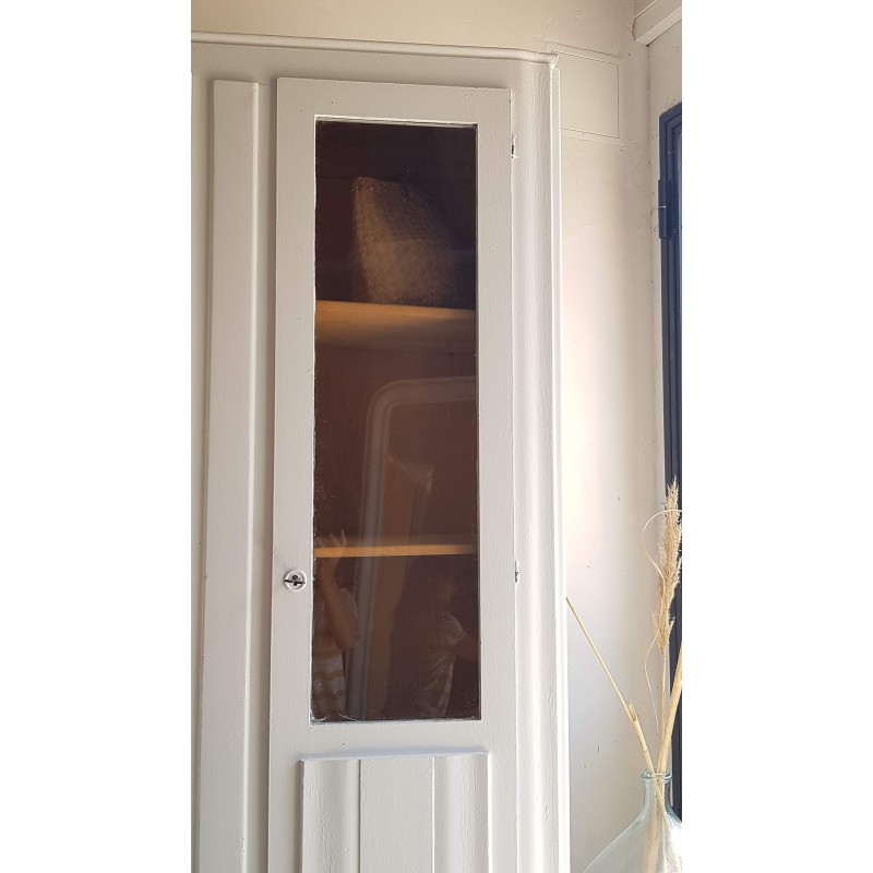 Superbe armoire parisienne vitrée, très belle. Repeinte en blanc par son ancien propriétaire,intérieur coquille passée. Elle a été peinte plusieurs fois au cours de sa vie. Une clé pour les deux portes.