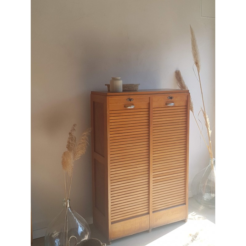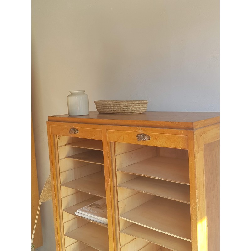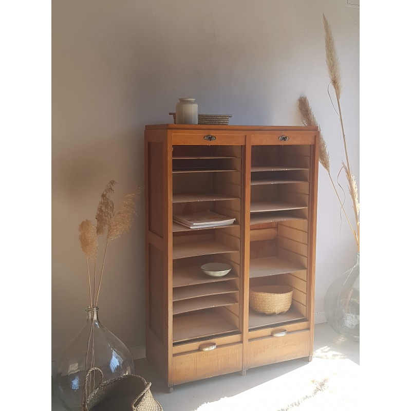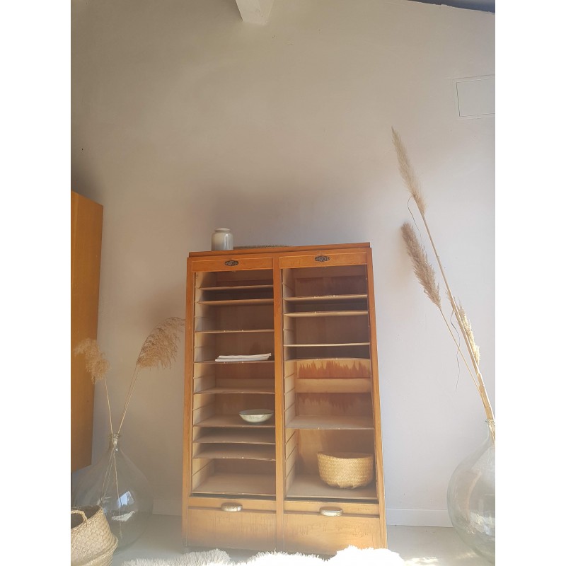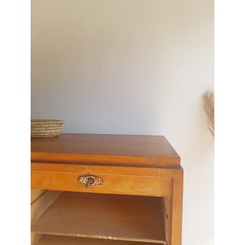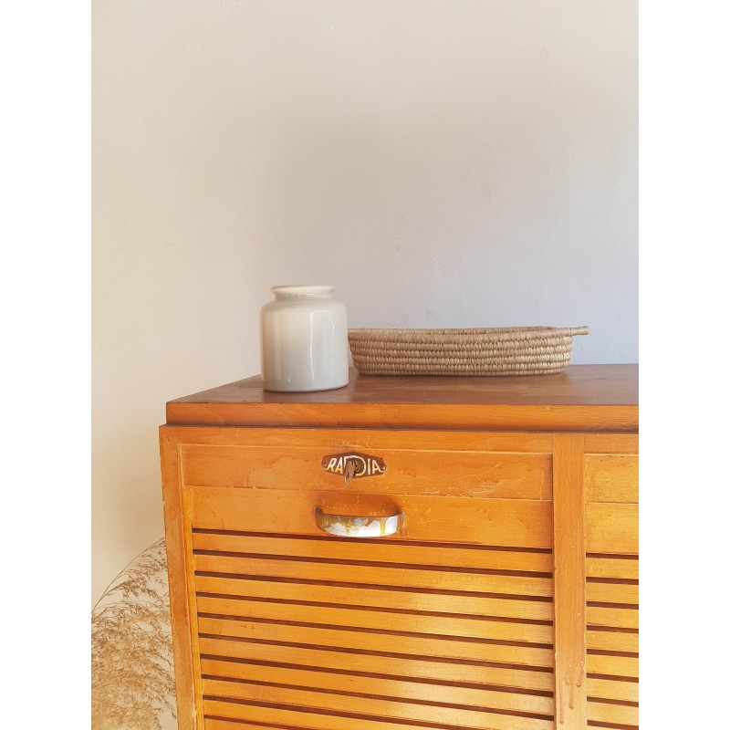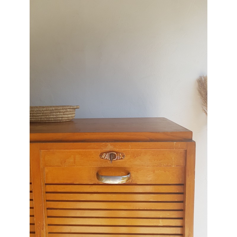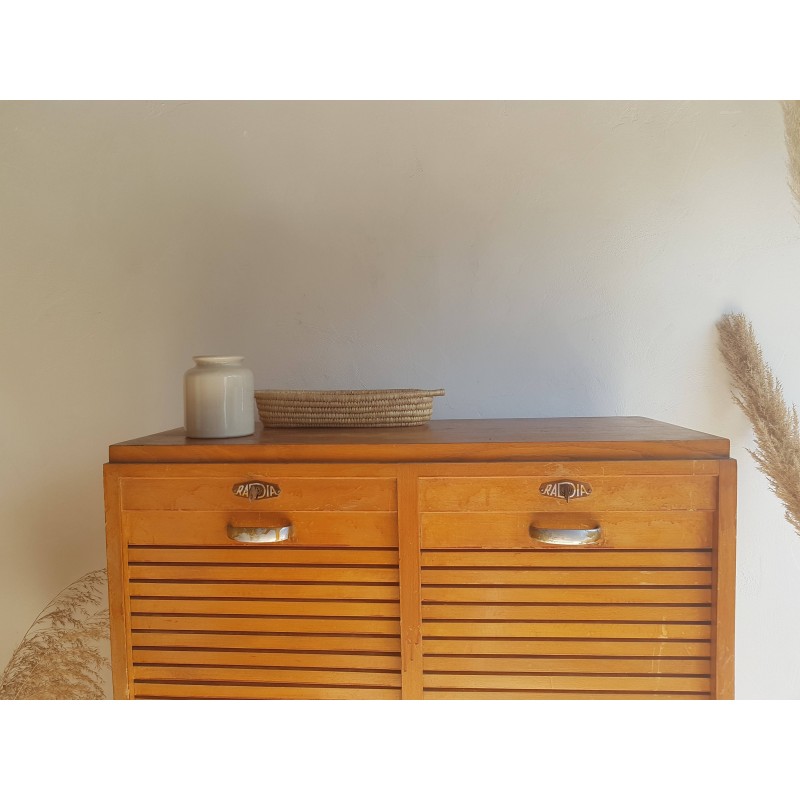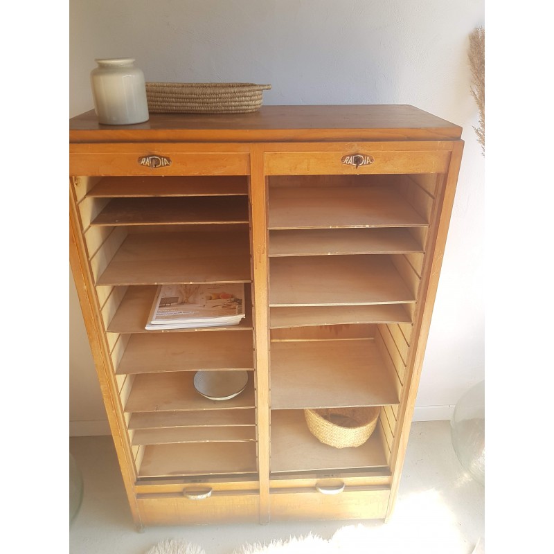 Superbe meuble de métier, circa années 50. Double classeurs à rideau ancien avec son estampille Radia au dessus de chaque poignée. Des imperfections visibles sur les photos. Stable. Les deux classeurs se déroulent sans difficulté.