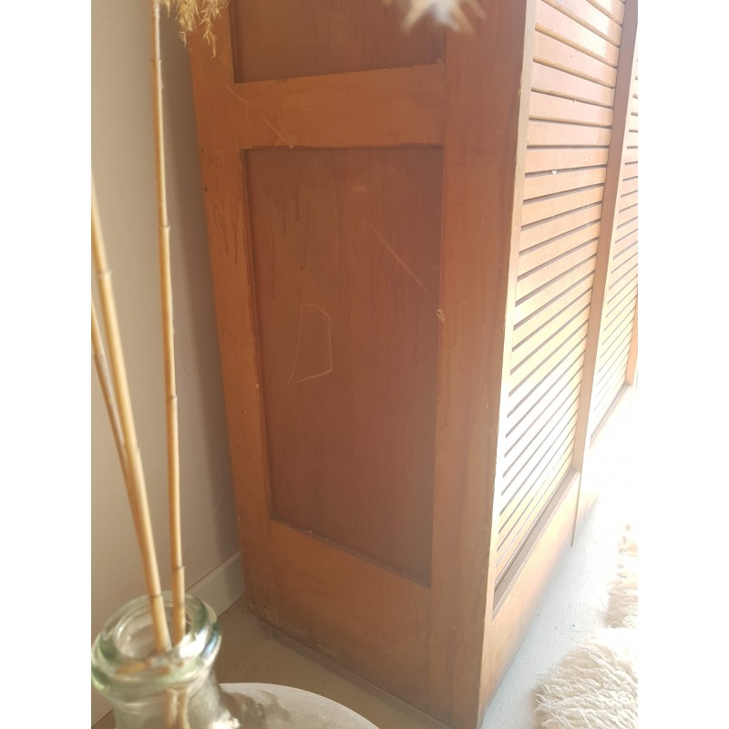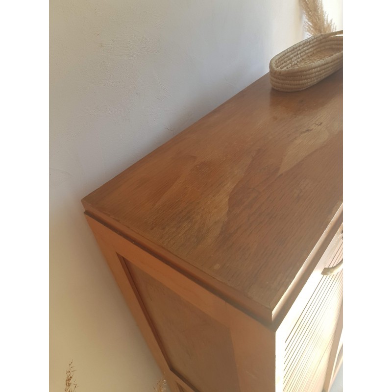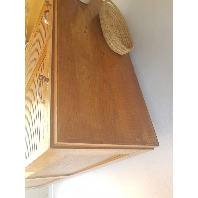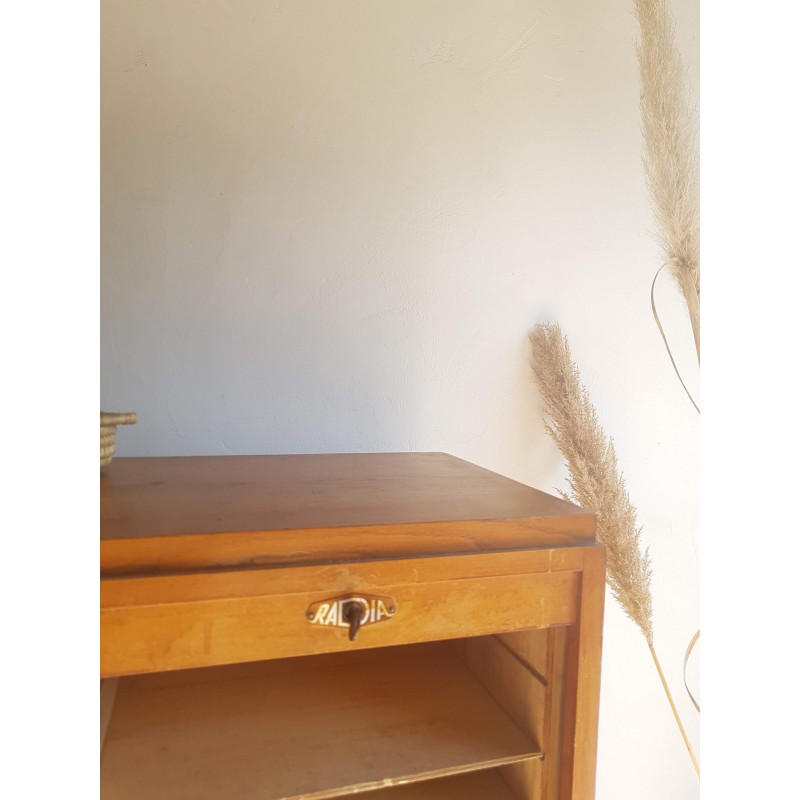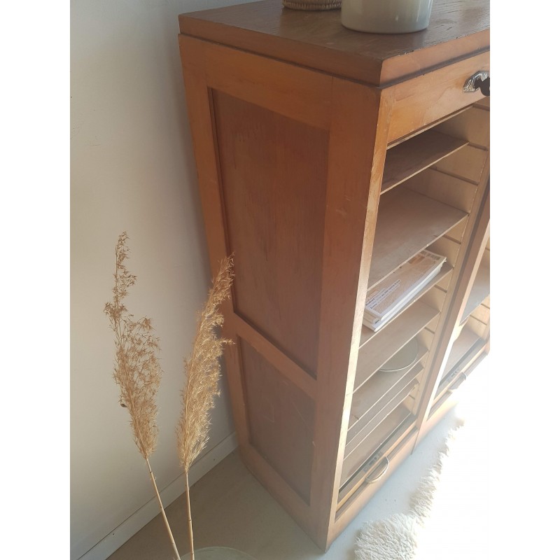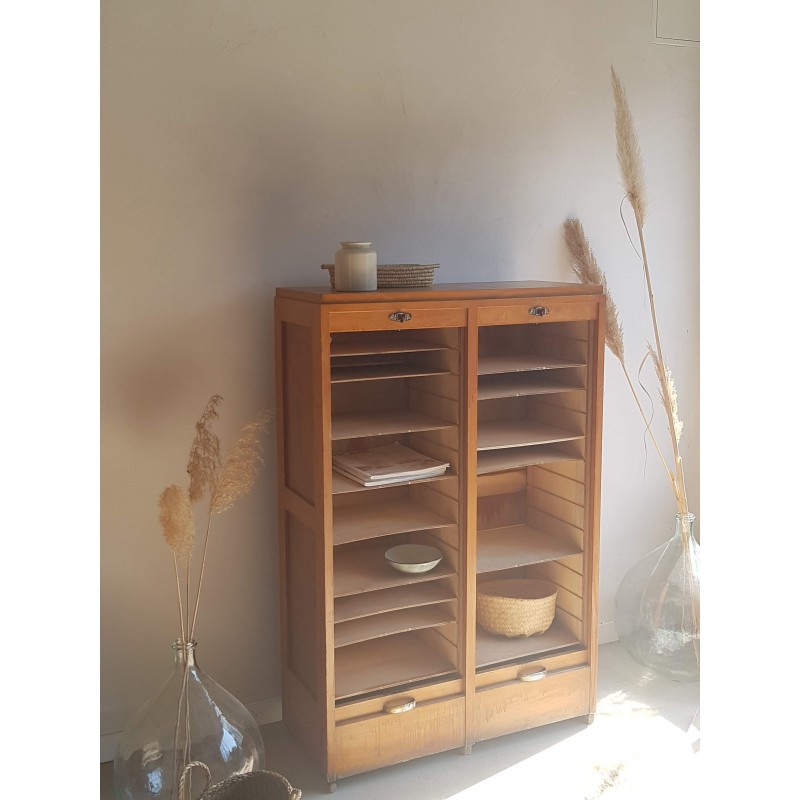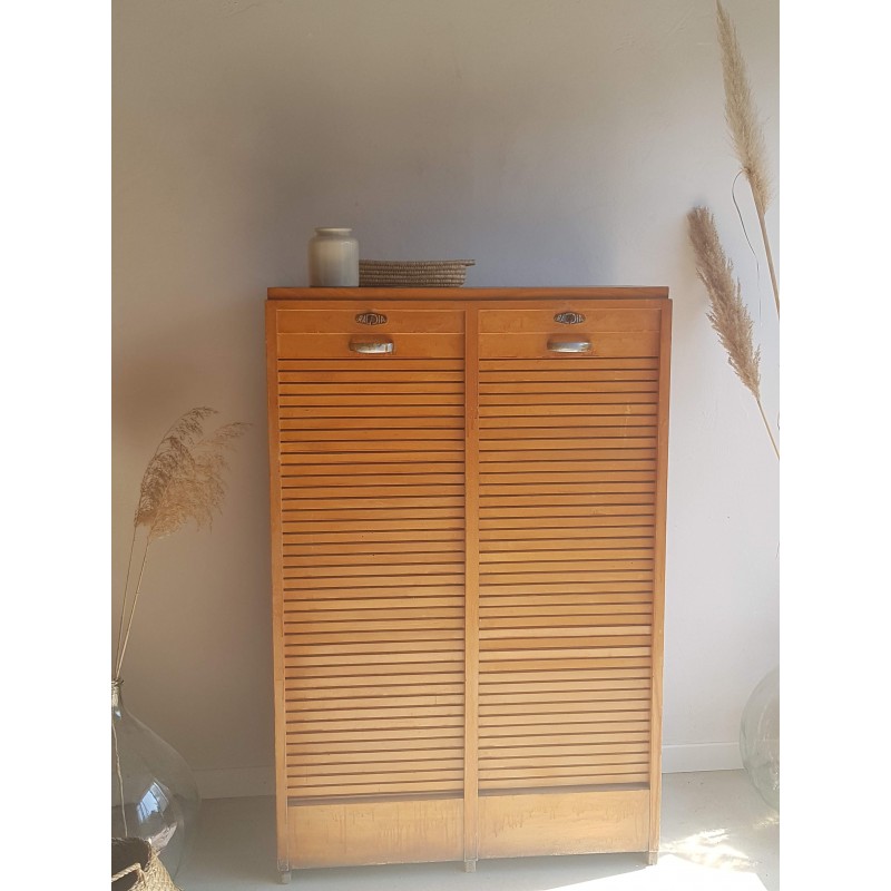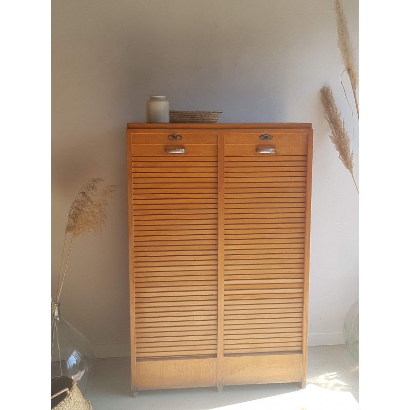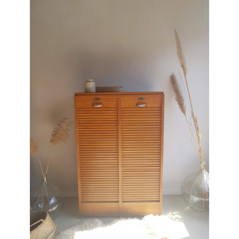 Superbe meuble de métier, circa années 50. Double classeurs à rideau ancien avec son estampille Radia au dessus de chaque poignée. Des imperfections visibles sur les photos. Stable. Les deux classeurs se déroulent sans difficulté.