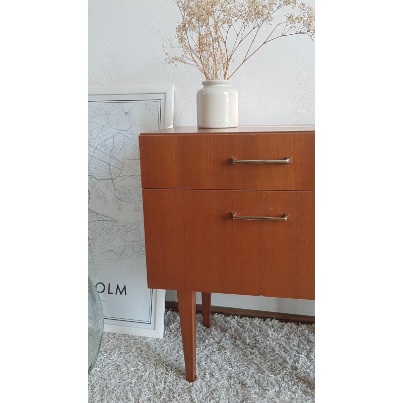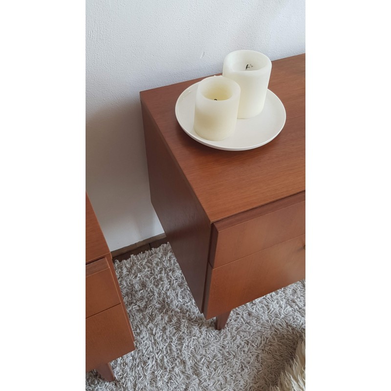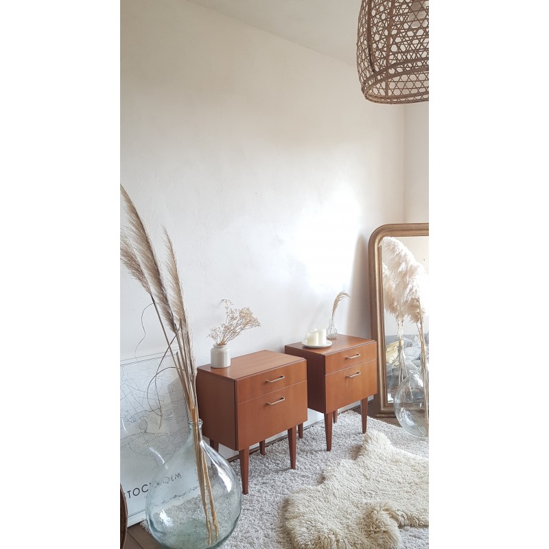 Superbe paire de tables de chevets scandinaves (logo made in Finland sous tiroir), circa 1960. Quelques rares imperfections visibles sur les photos. Stable. Belle patine.