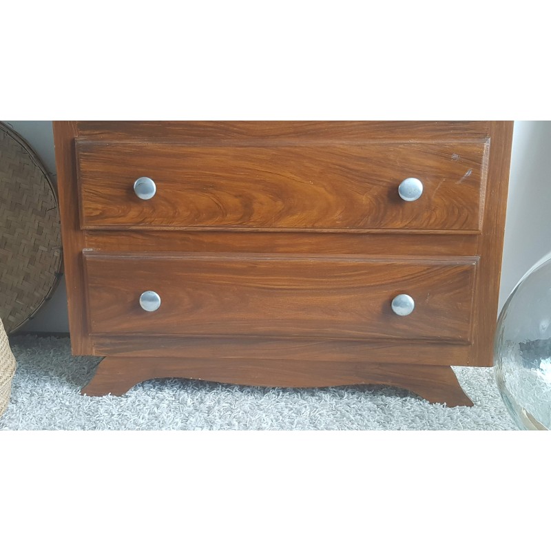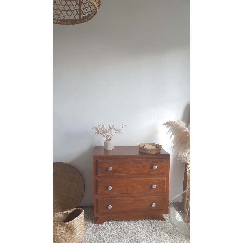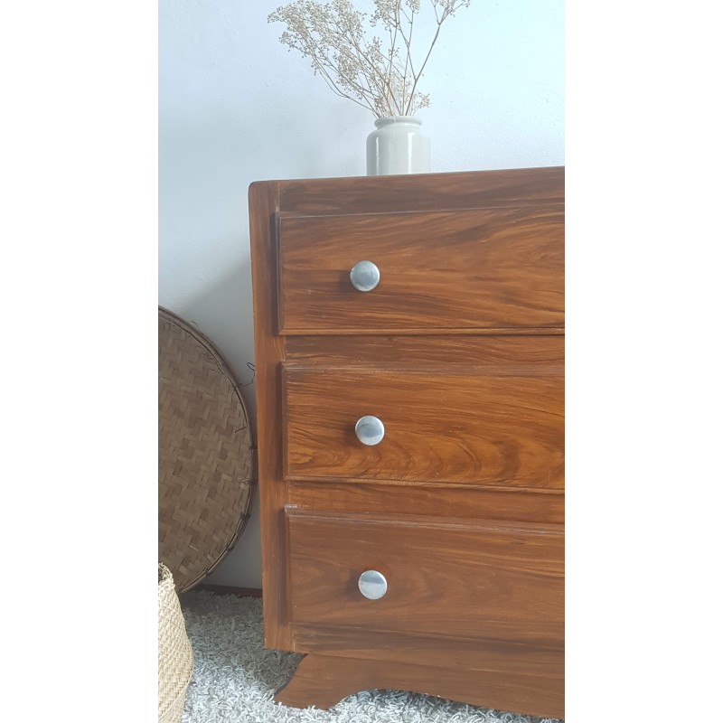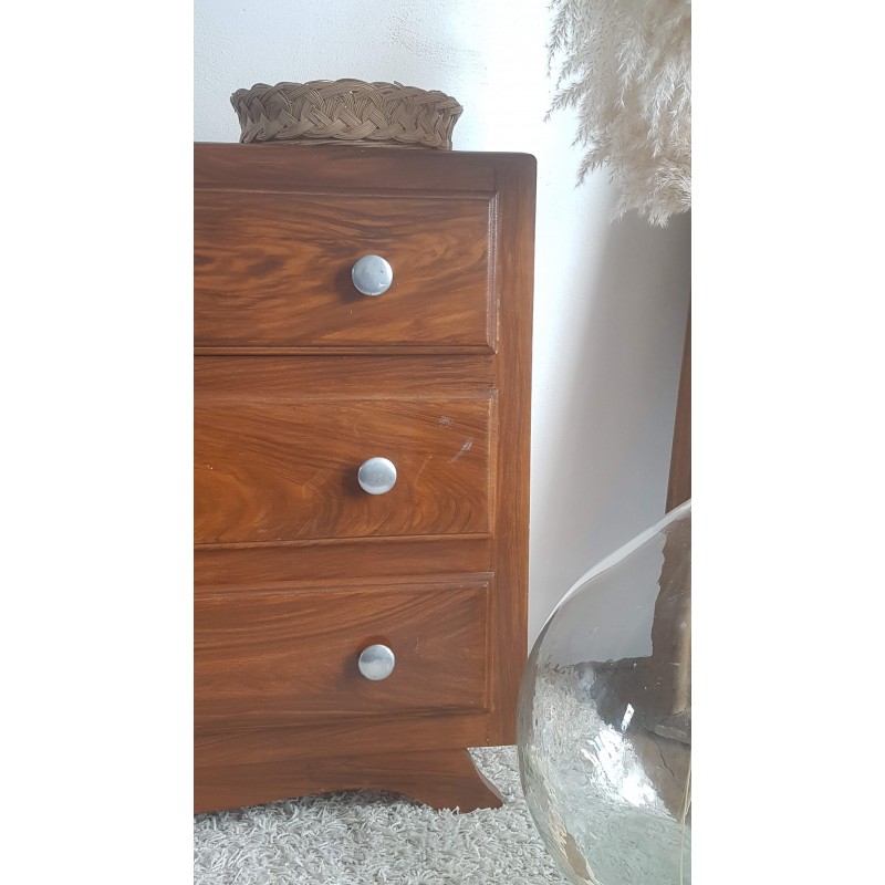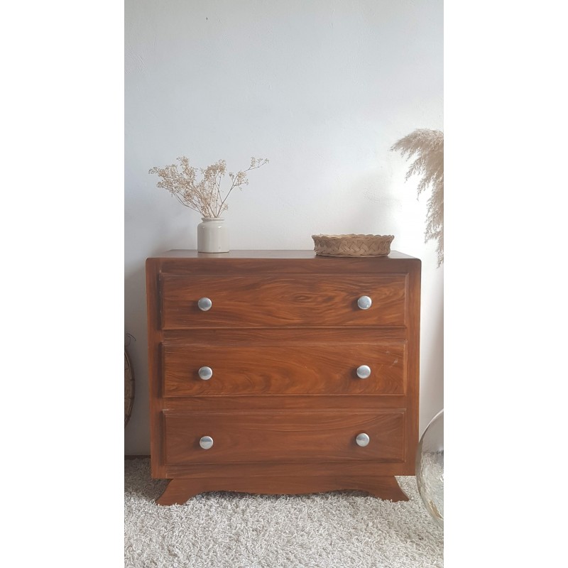 Adorable commode art déco, pieds moustaches. Facile à glisser dans un intérieur contemporain avec son gabarit parfait. Quelques petites imperfections visibles sur les photos. Stable. Les tiroirs coulissent bien.