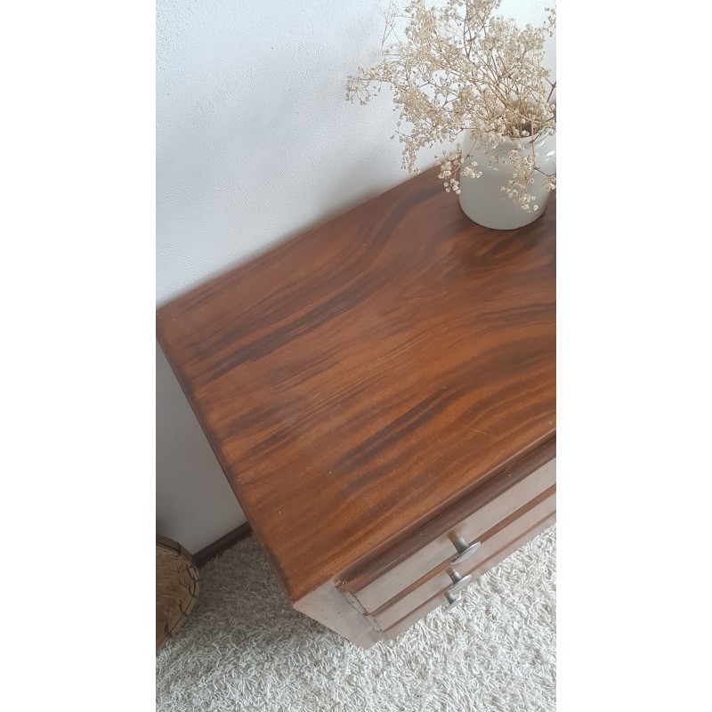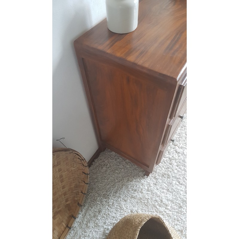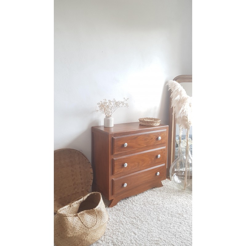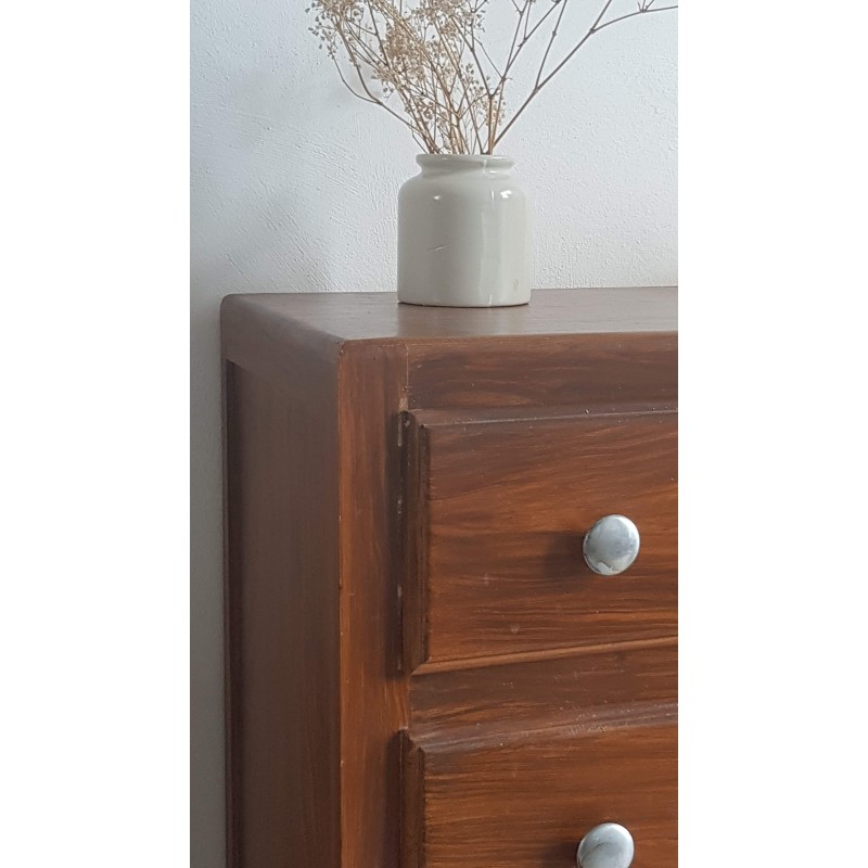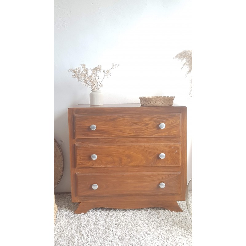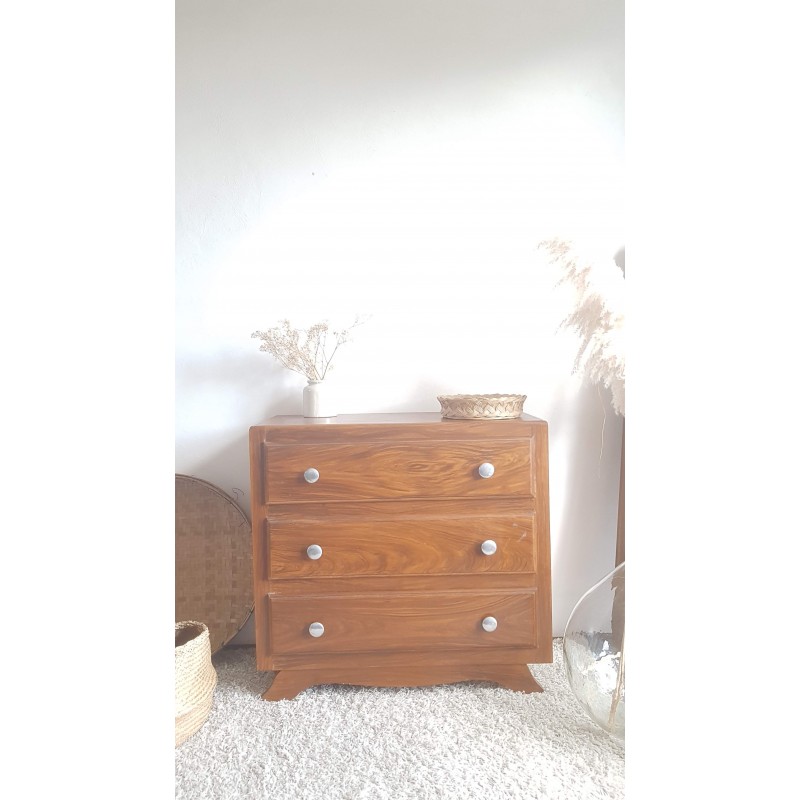 Adorable commode art déco, pieds moustaches. Facile à glisser dans un intérieur contemporain avec son gabarit parfait. Quelques petites imperfections visibles sur les photos. Stable. Les tiroirs coulissent bien.