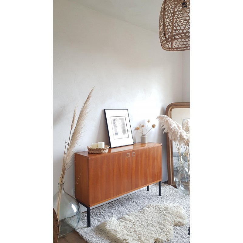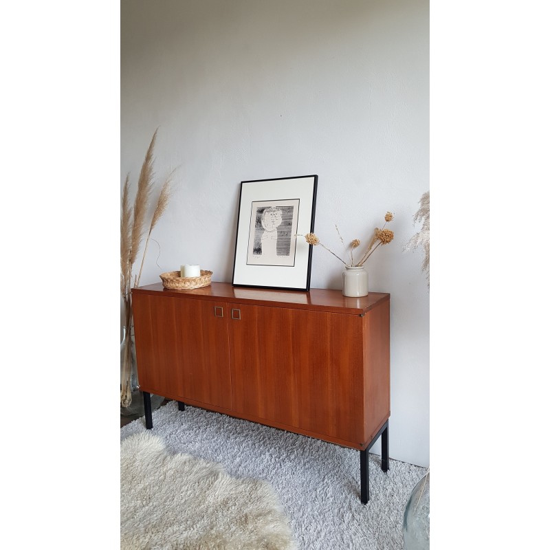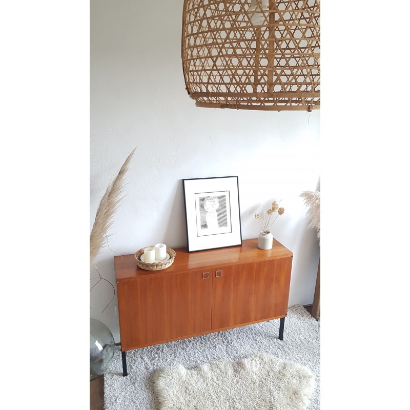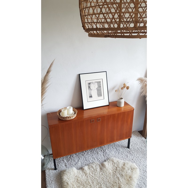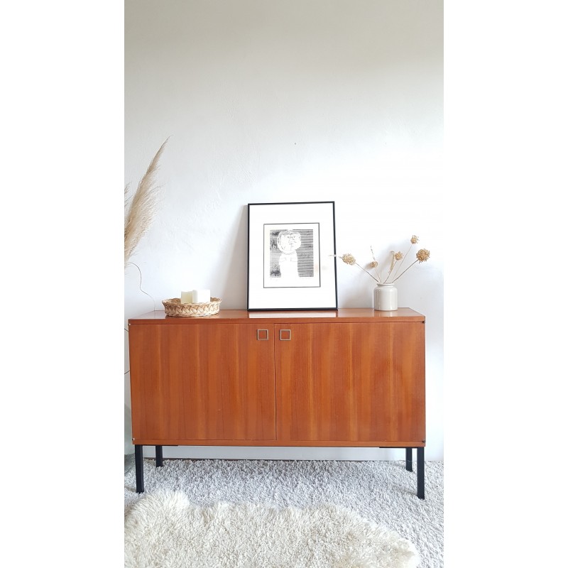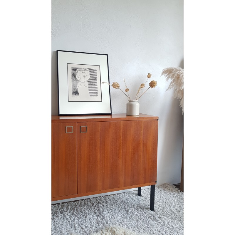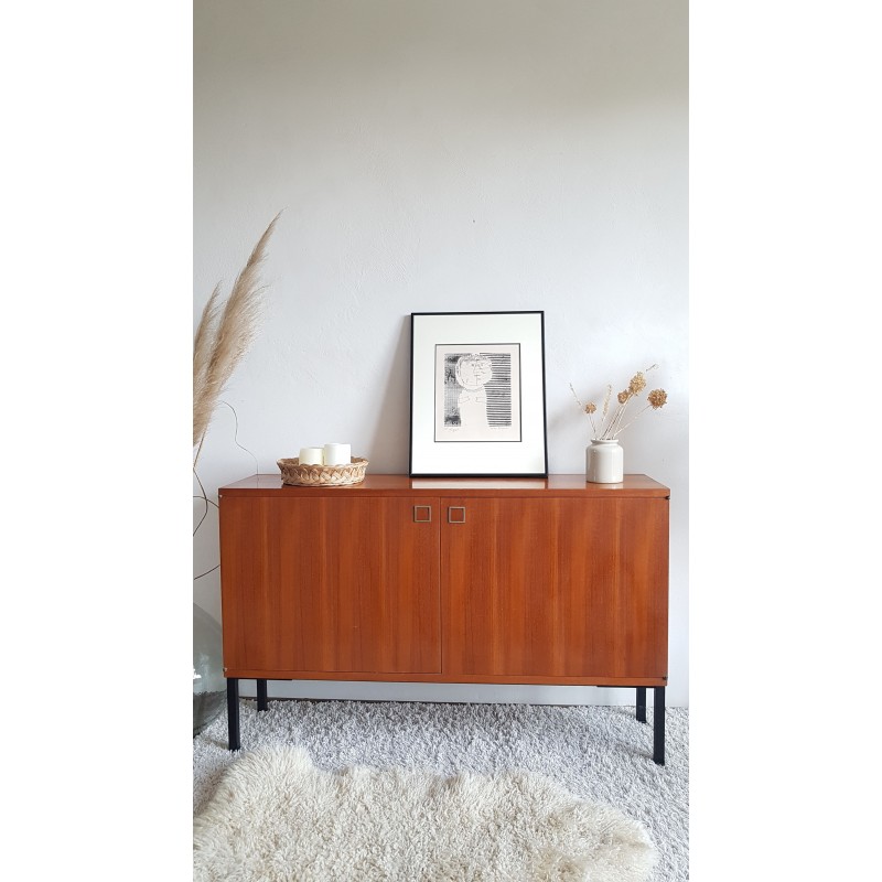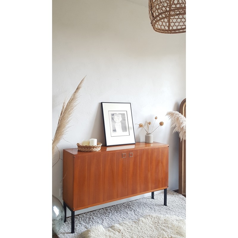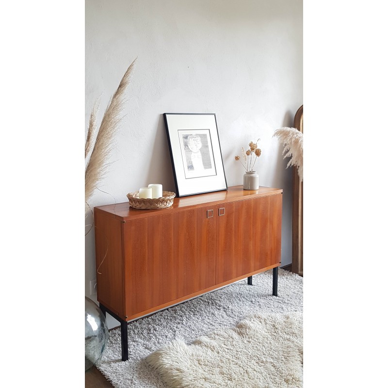 Superbe petite enfilade, buffet moderniste des années 60. Très élégante. Quelques petites imperfections visibles sur les photos. Stable. Lignes épurées. Détails raffinées des poignées. Très belle pièce de design mid-century.