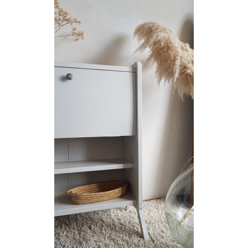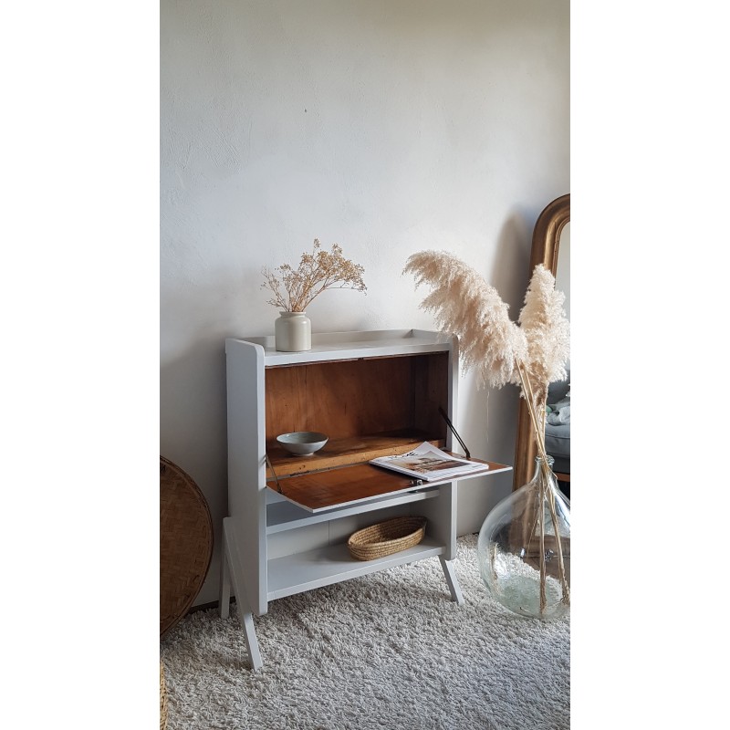 Adorable PETIT (cf dimensions) secrétaire pied compas circa années 60, peint en gris perle/taupe par son ancienne propriétaire. Des imperfections visibles sur les photos. Stable. Un charme fou.