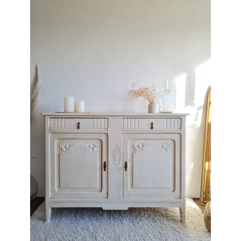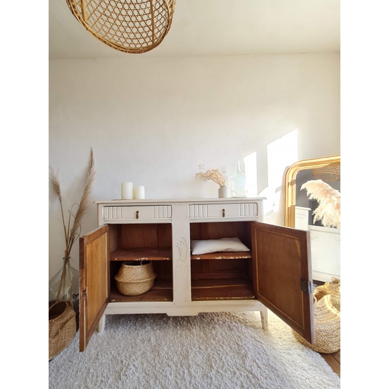 Elégant buffet parisien vintage, très fonctionnel avec une belle capacité de rangement. Beaucoup de charme, belle patine coquille d'oeuf, peut être un peu plus soutenue que sur le rendu photo qui semble plus beige. C'est un meuble qui a été repeint plusieurs fois au cours de vie. Quelques imperfections visibles sur les photos, dont absence de serrure sur la gauche. Stable. Très belles lignes. Raffiné.