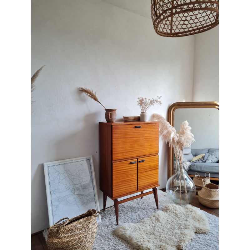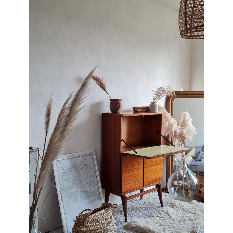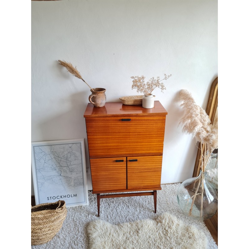 Superbe petit secrétaire moderniste années 60. Petit gabarit, ultra facile à glisser dans un intérieur contemporain. Quelques imperfections visibles sur les photos. Stable. Peu commun avec ses pieds compas, rare .