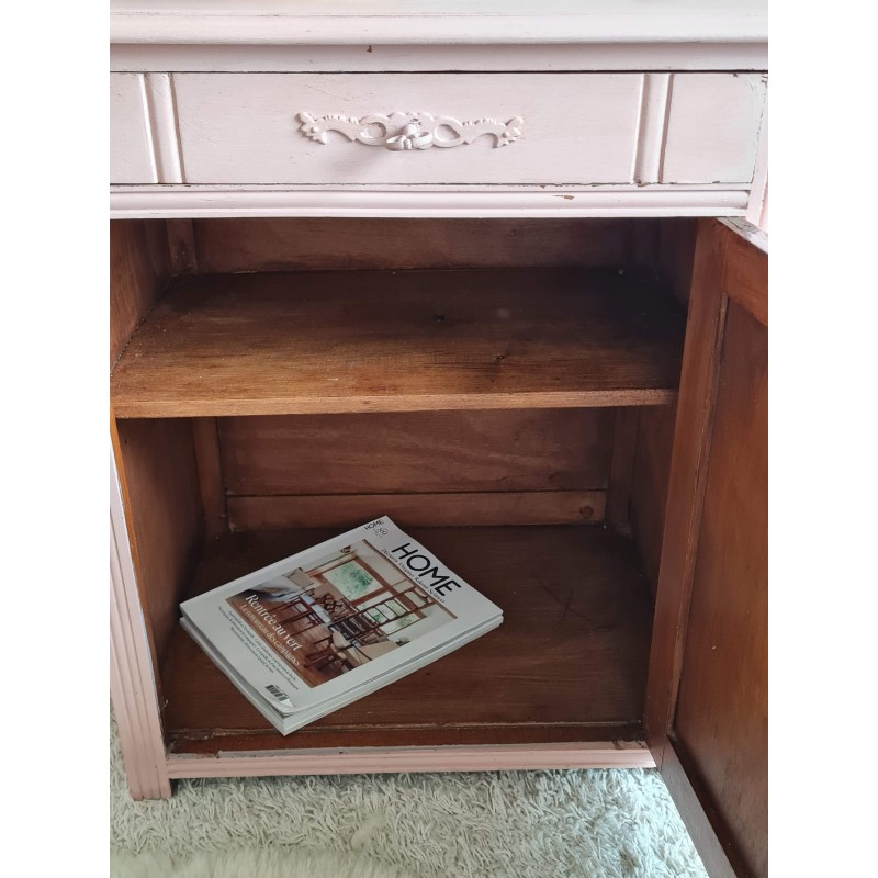 Charmant confiturier art déco, repeint en vieux rose par son ancienne propriétaire. Très bohème chic. Des petites imperfections visibles sur les photos. A noter la porte nécessite une légère impulsion vers le haut à l'ouverture, idem vers le bas à la fermeture. Stable. Pièce unique. Très chic et intemporel.