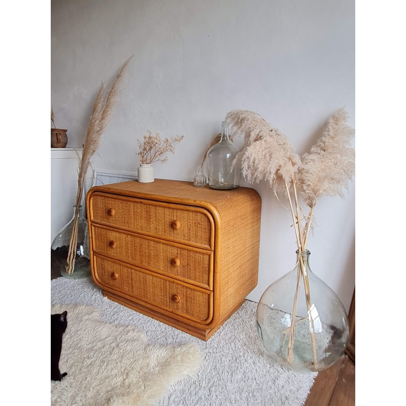 Superbe commode en rotin vintage. Très belle patine miel. Rare, très belle singularité.
