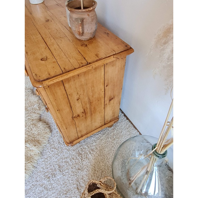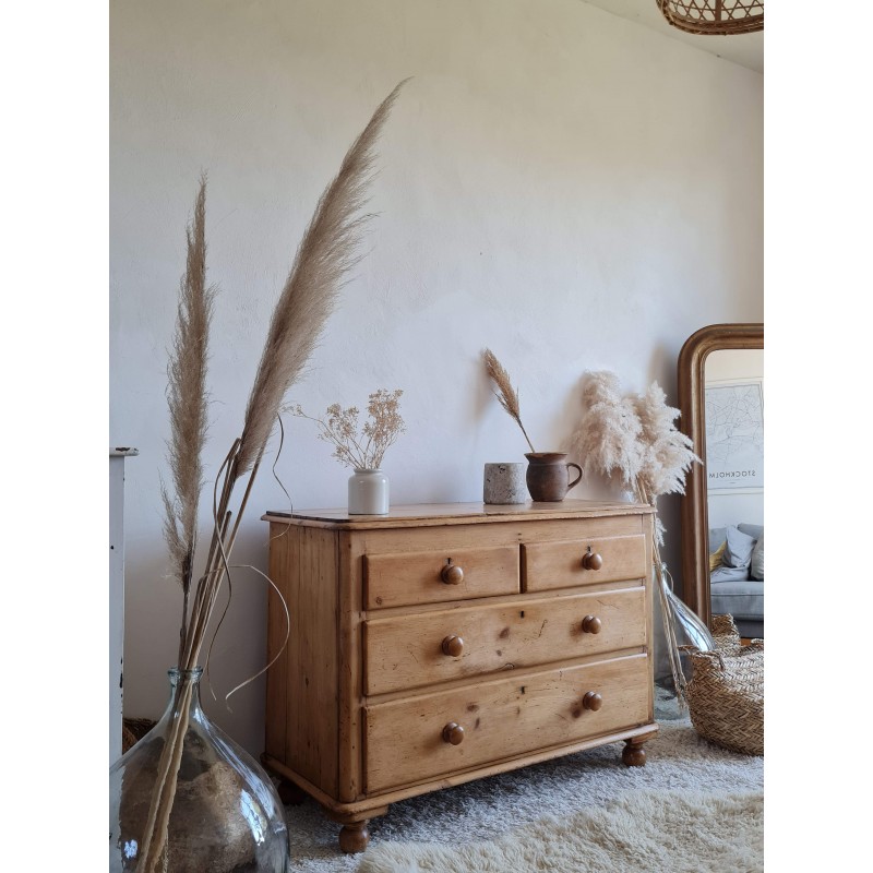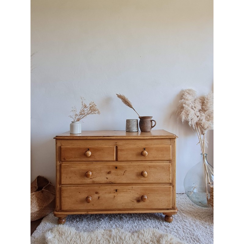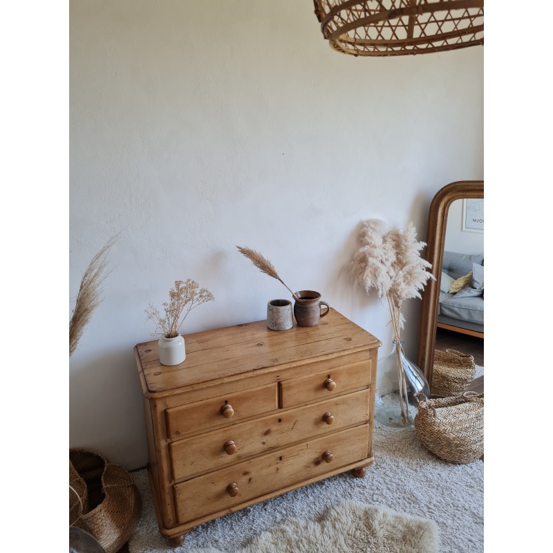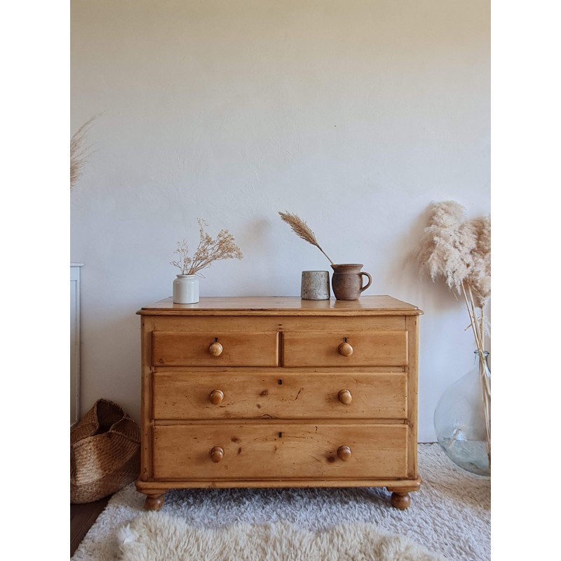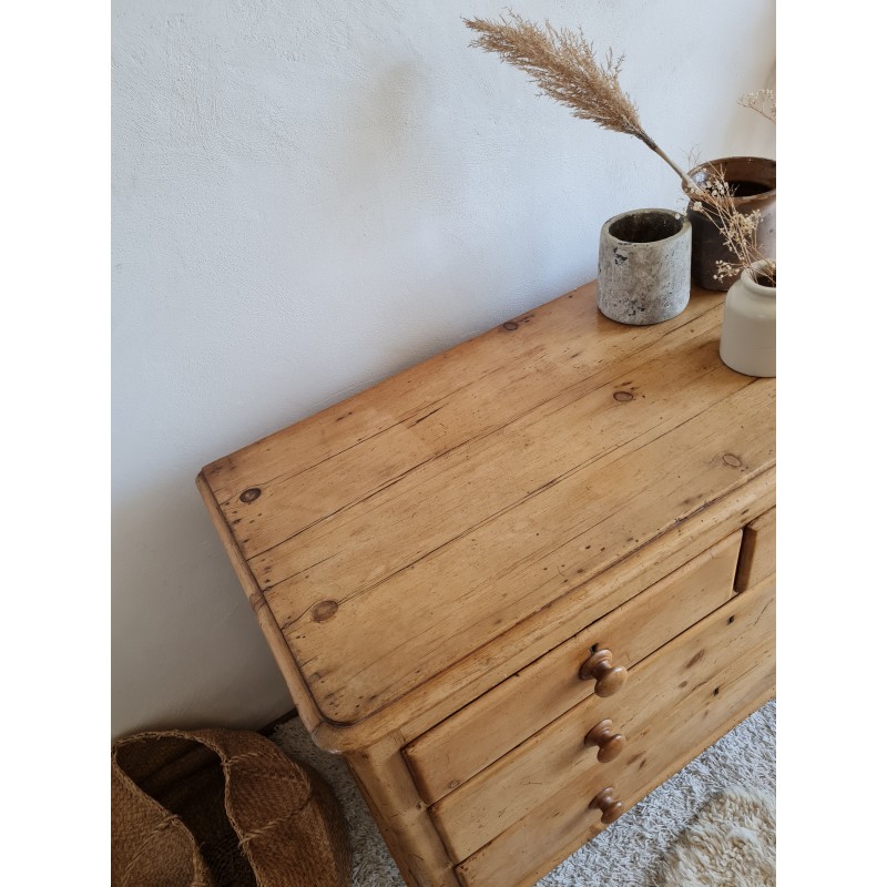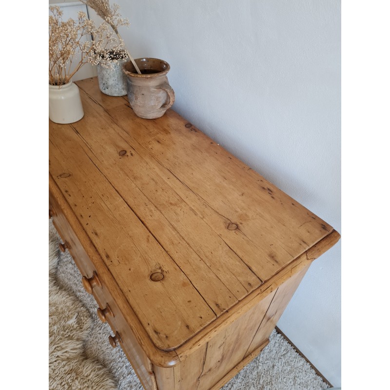 Superbe commode ancienne de style anglais. Belle sobriété, une simplicité pleine de charme. Quelques imperfections visibles sur les photos. Très belle patine miel. Les tiroirs coulissent bien.