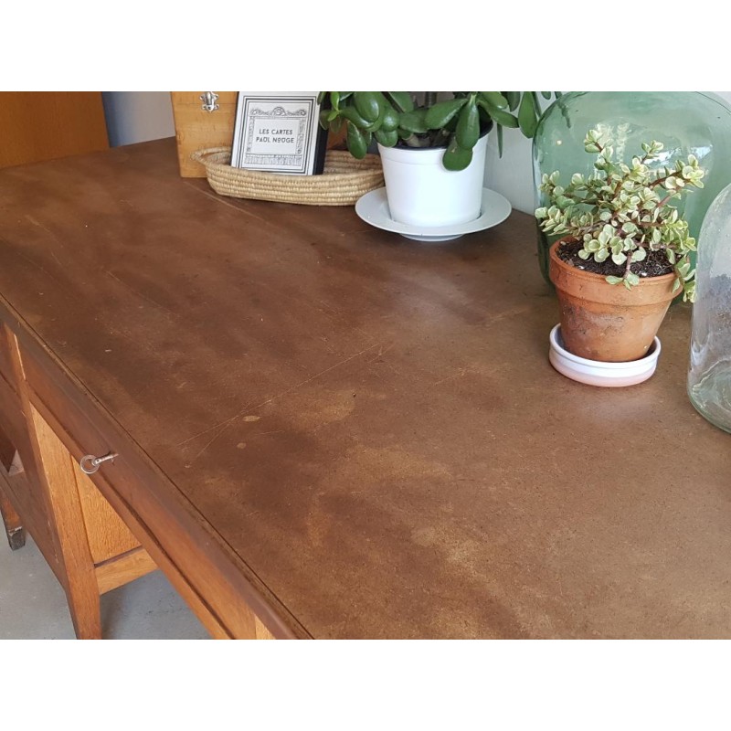 Piètement en bois et plateau en bois reconstitué. Stable. Des traces de vies et quelques manquements visibles sur les photos. Les tiroirs coulissent bien.