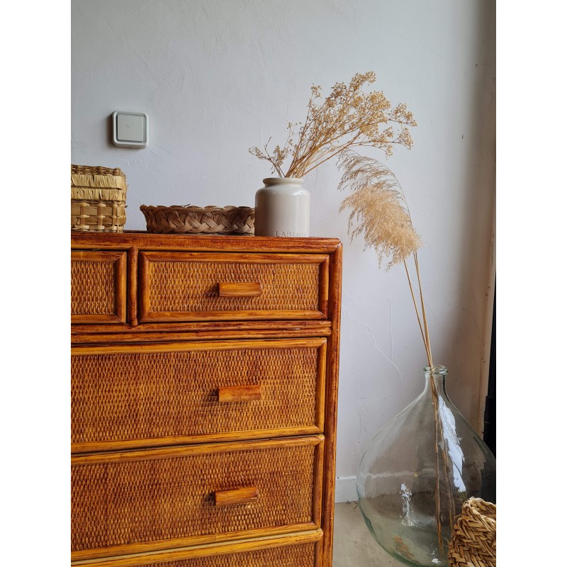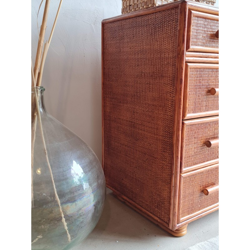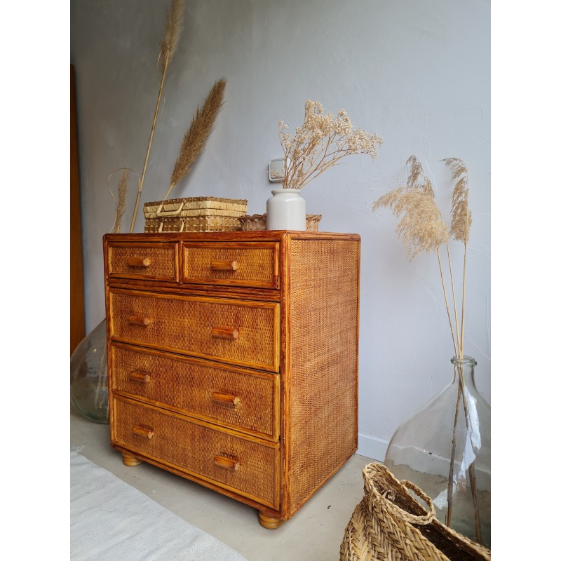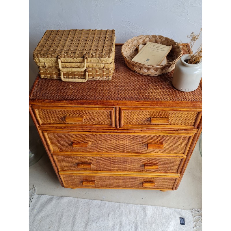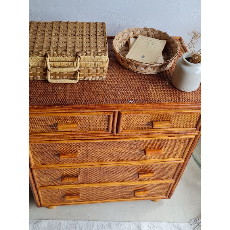 Adorable commode en rotin vintage, avec une superbe patine miel.