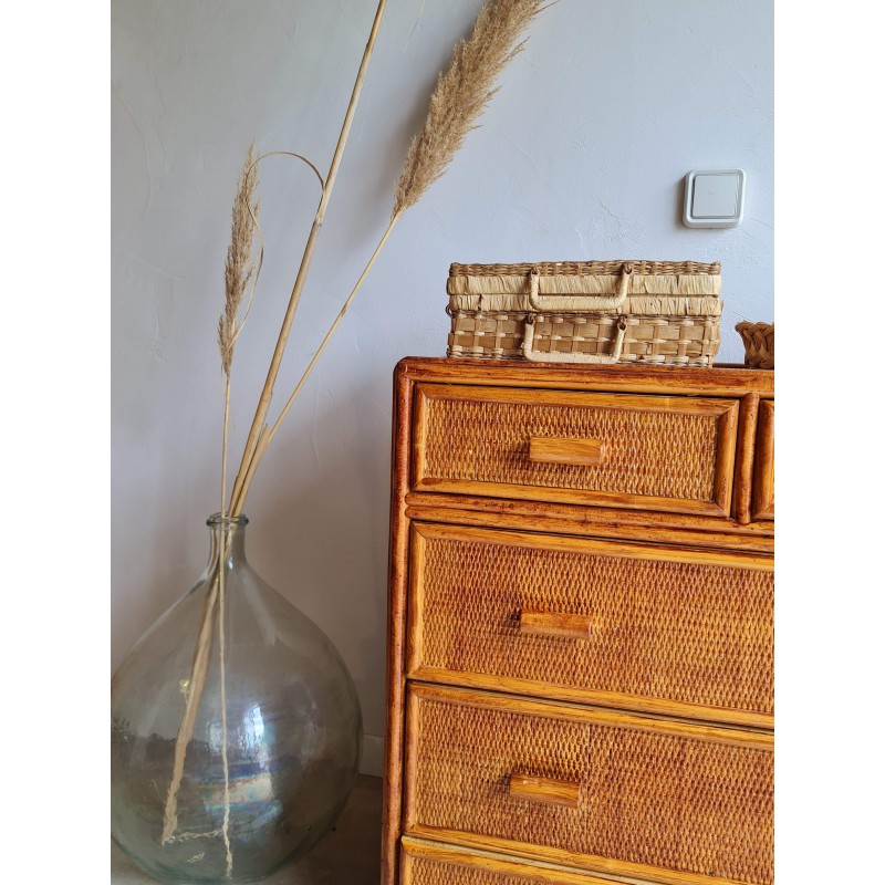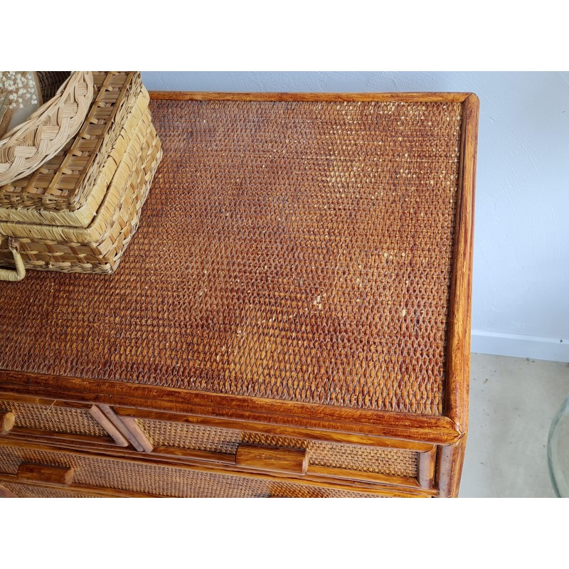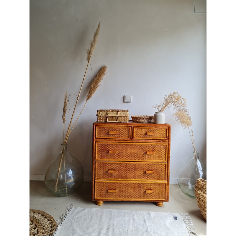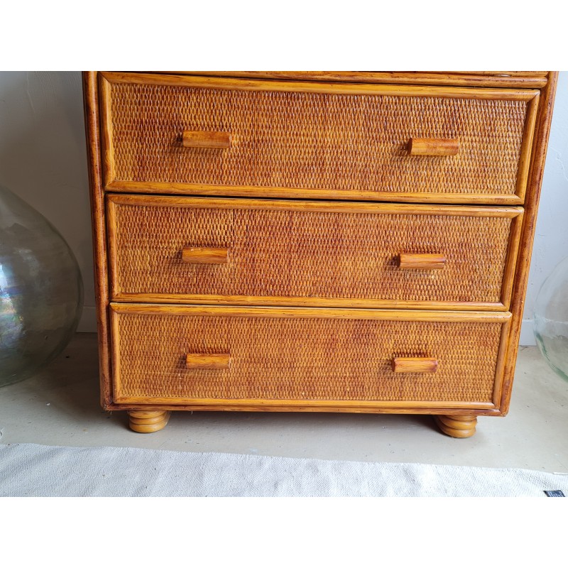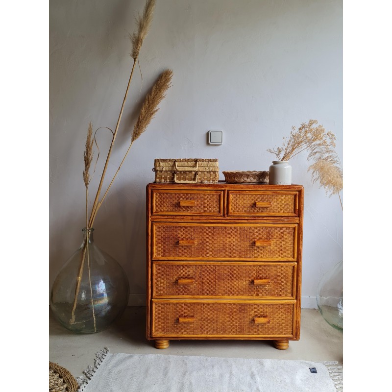 Adorable commode en rotin vintage, avec une superbe patine miel.