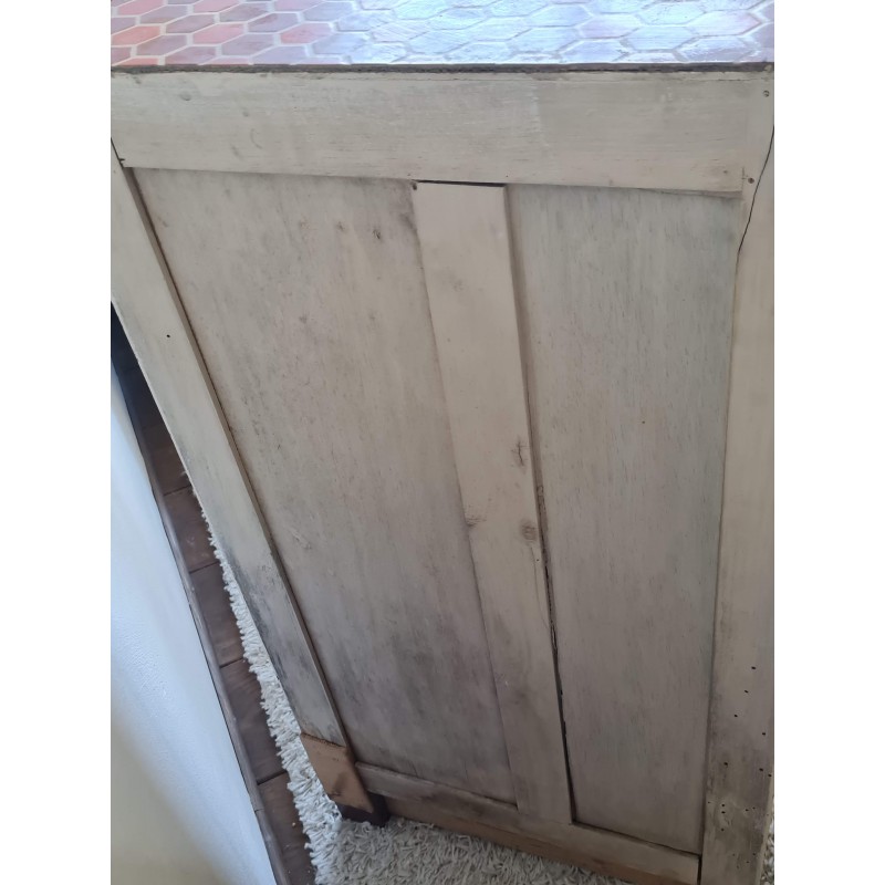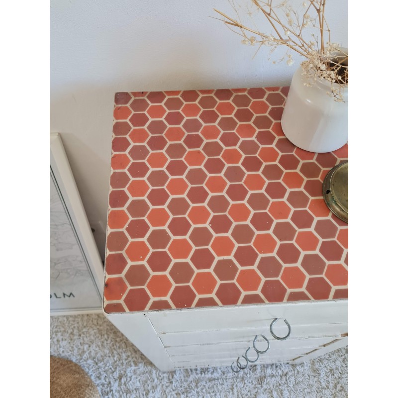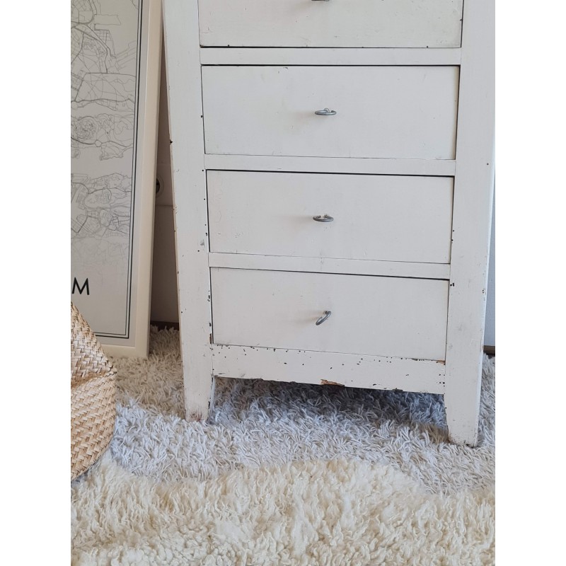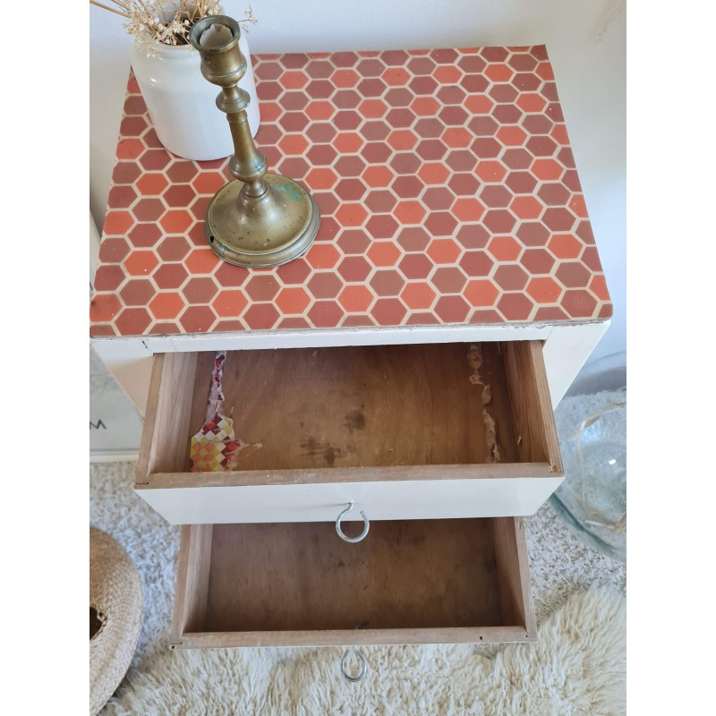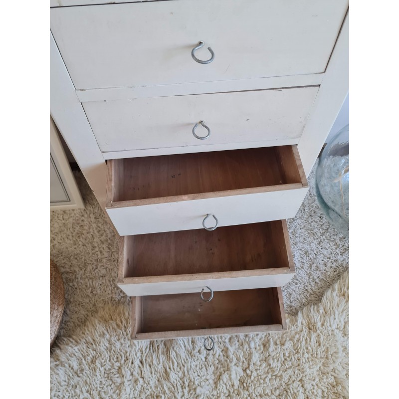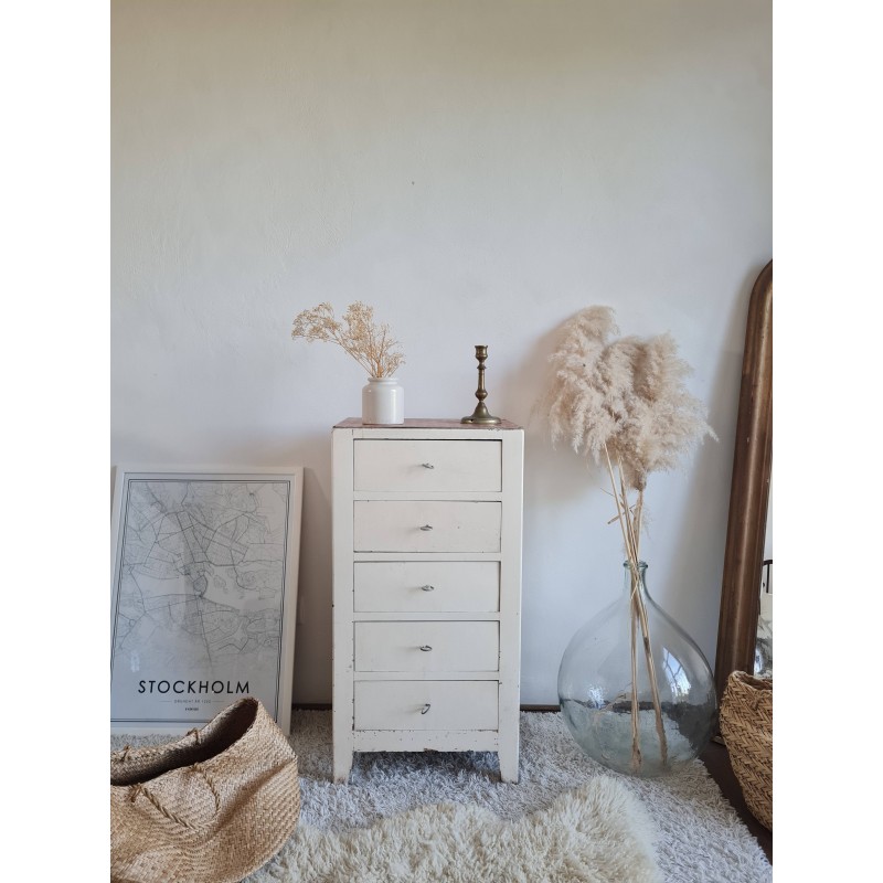 Joli chiffonnier/buffet vintage. Enormément de charme. Des imperfections visibles sur les photos. Il est dans son jus, des trous anciens de vrillettes ( qui ne s'y trouvent plus)et une réparation ancienne solide sur un pied arrière. Le revêtement vintage du plateau peut se décoller facilement, si souhaité. Stable. Les tiroirs coulissent bien.