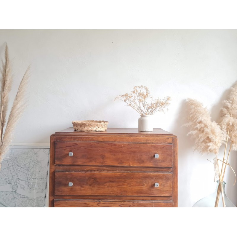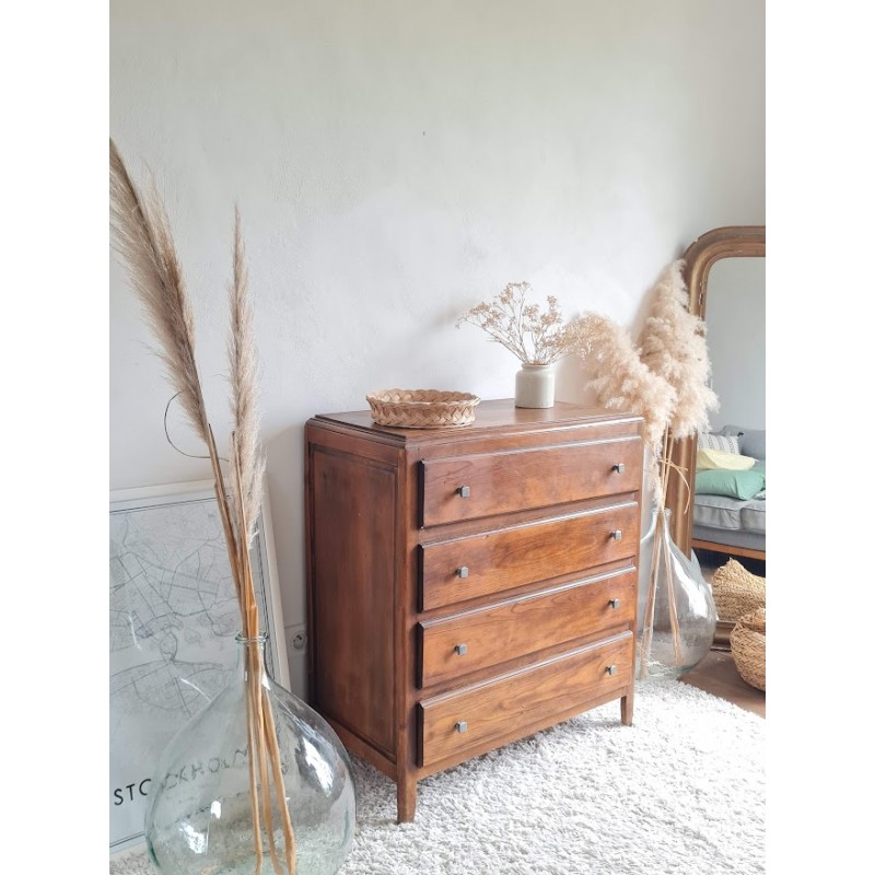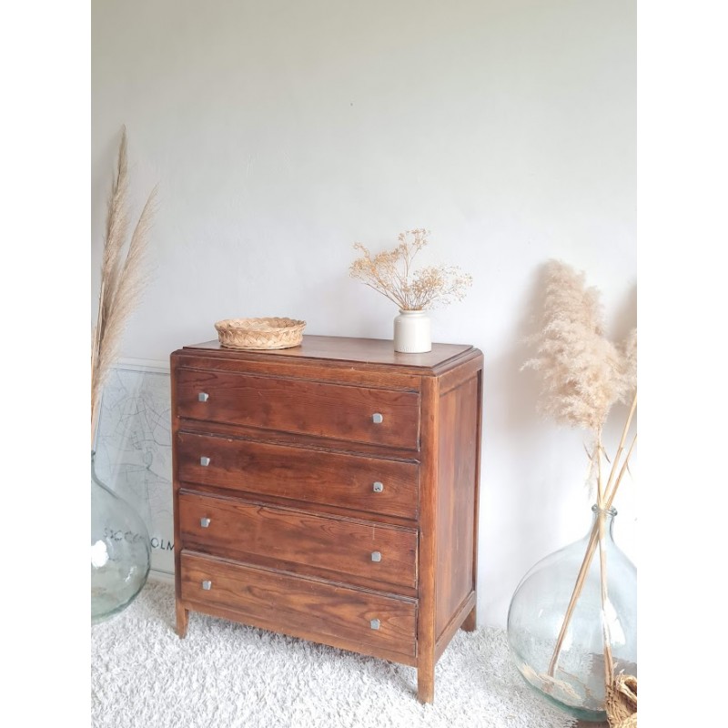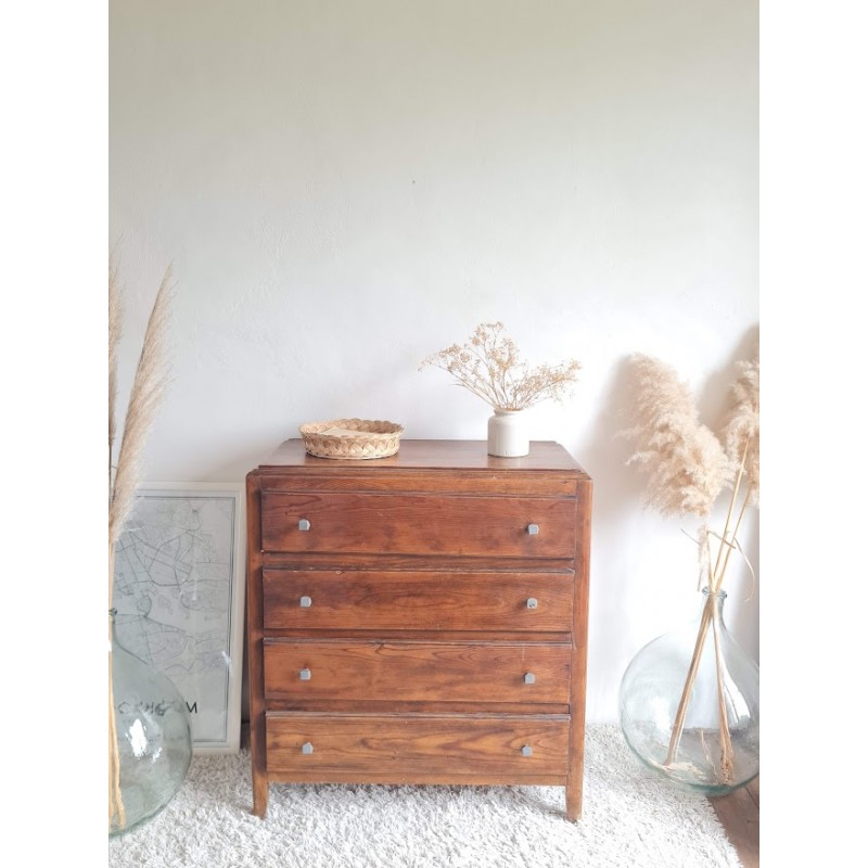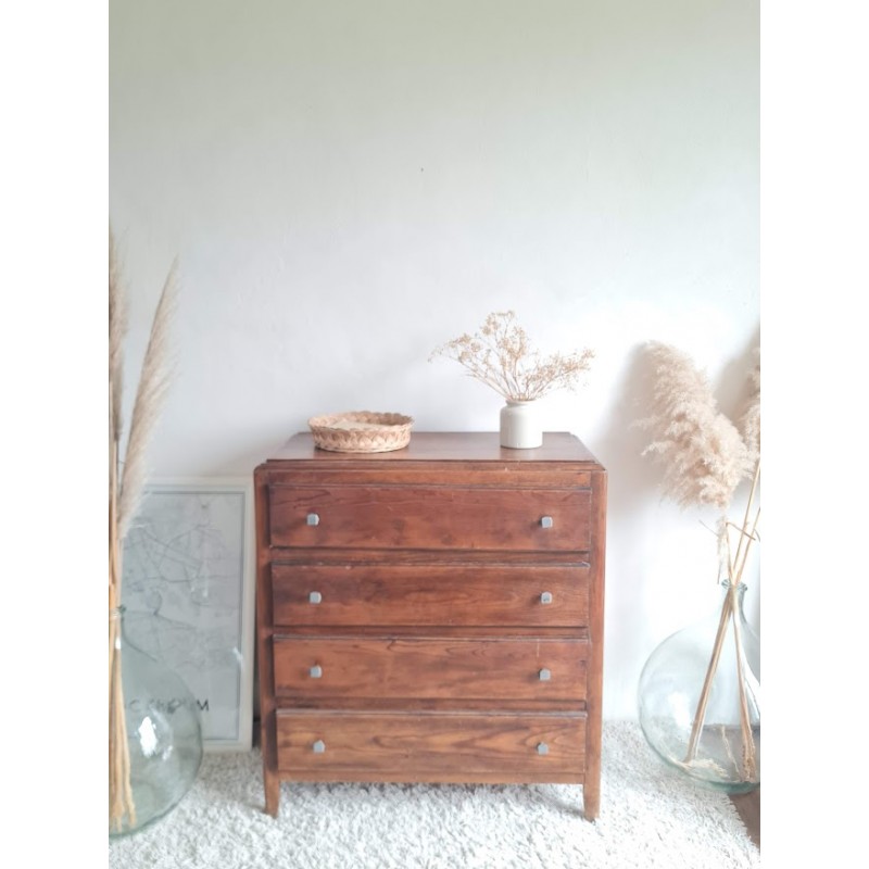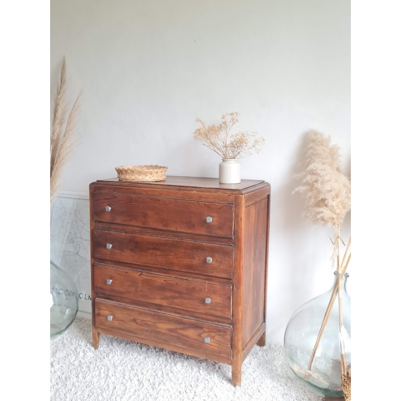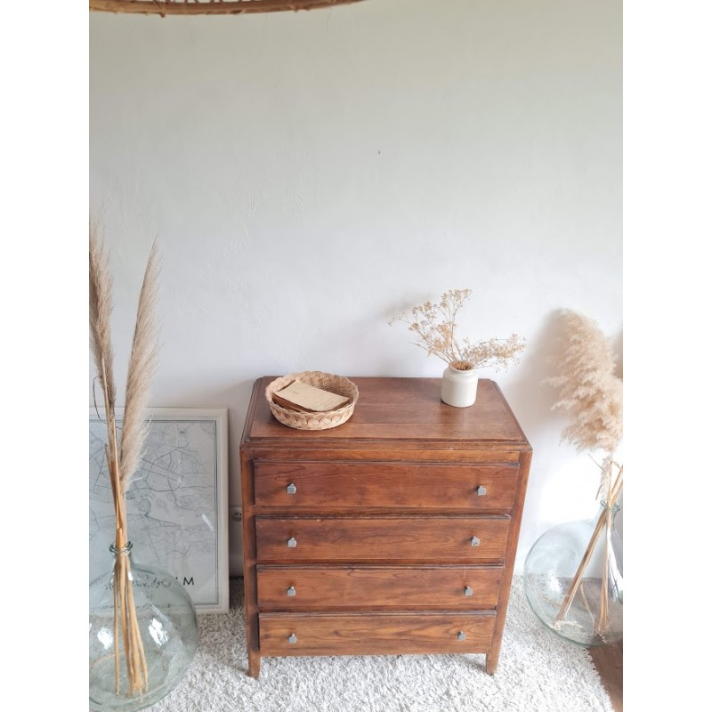 Adorable commode années 60, très jolie patine. Quatre tiroirs qui coulissent bien, jolis boutons de poignée.