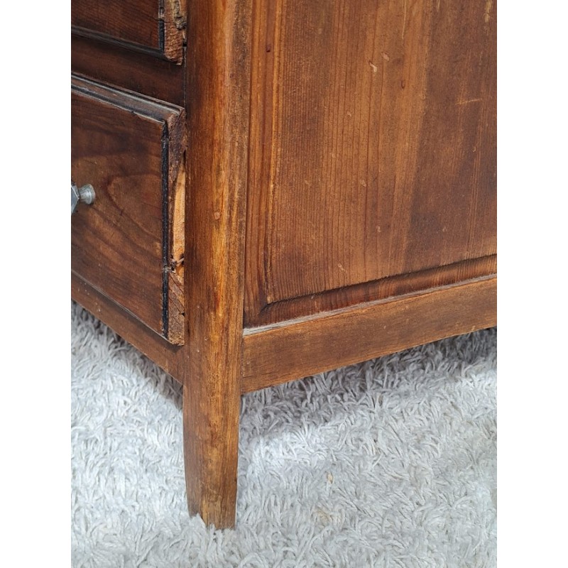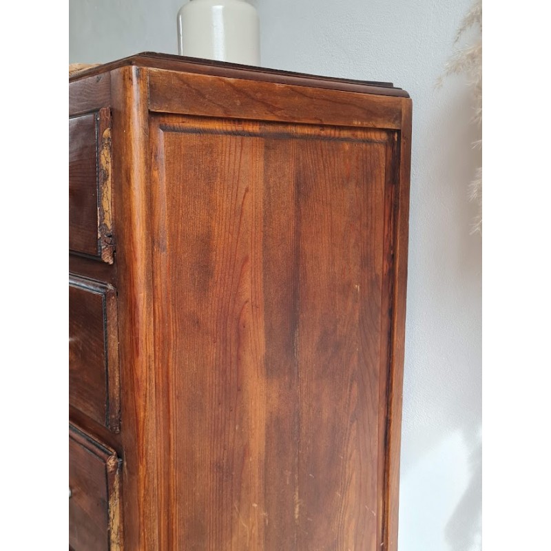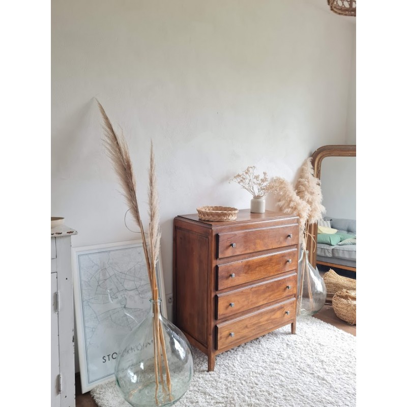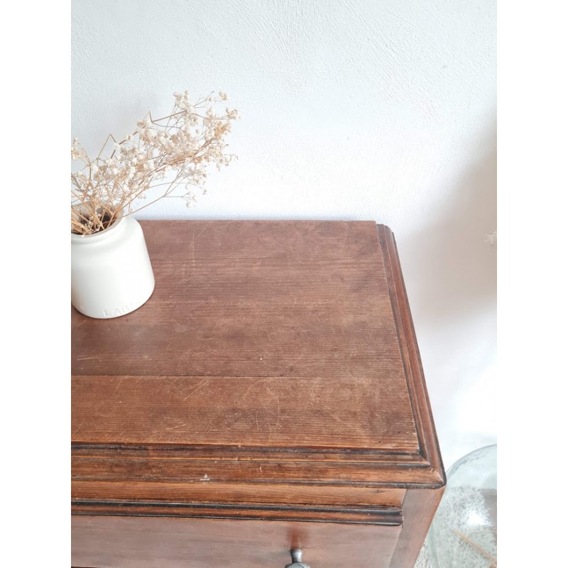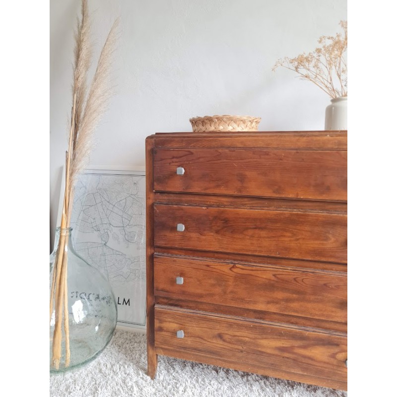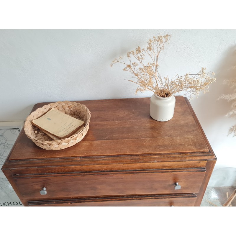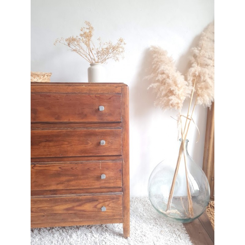Adorable commode années 60, très jolie patine. Quatre tiroirs qui coulissent bien, jolis boutons de poignée.