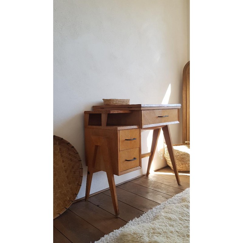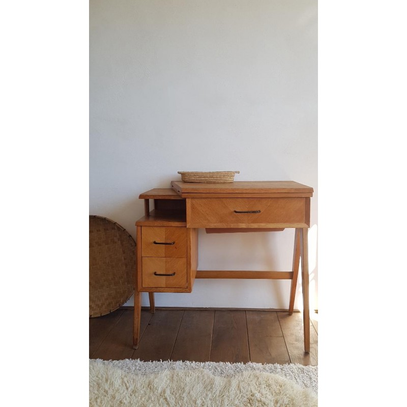 Le plateau peut se déplier car à l'origine il s'agit d'un meuble de couture. mais il ne peut plus être être utilisé de la sorte. Le plus grand tiroir permet de ranger une trousse et quelques stylos, pinceaux etc (cf photos). Toutefois les deux tiroirs sur le côté et la niche supérieure offrent un espace de rangement intéressant. A noter, un peu de jeu sur le premier tiroir.