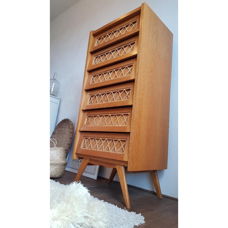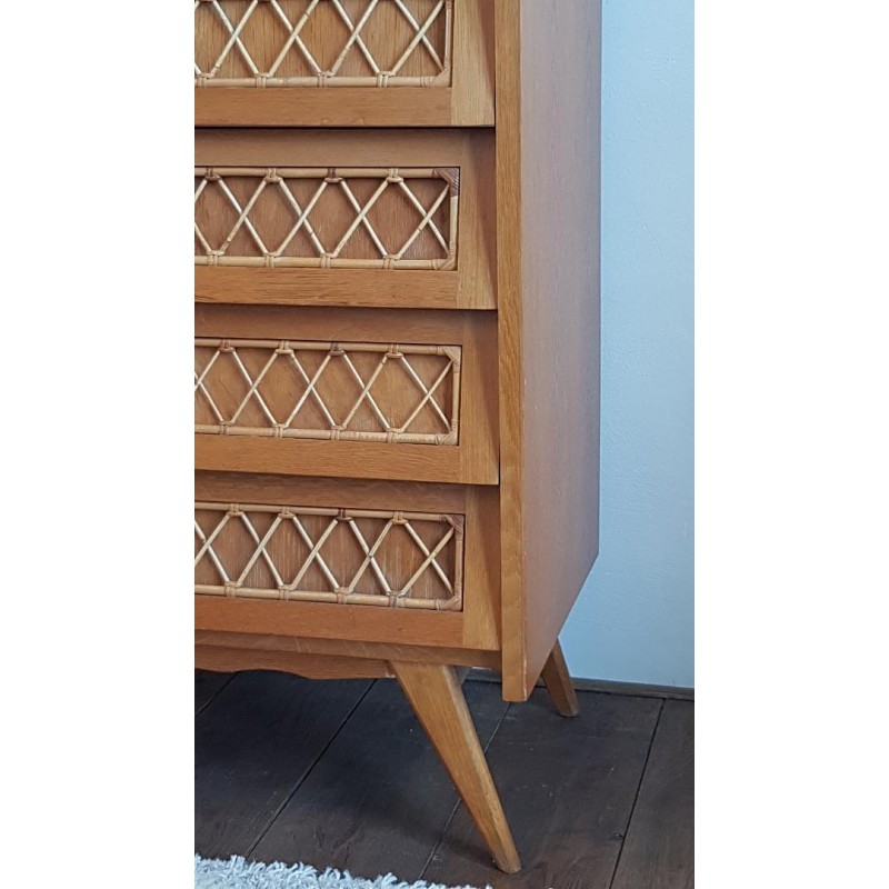 Superbe chiffonnier rotin et bois, pieds compas.
